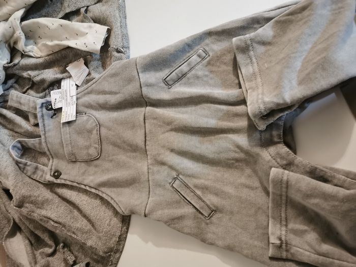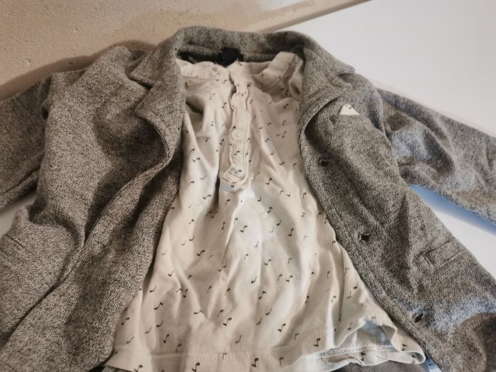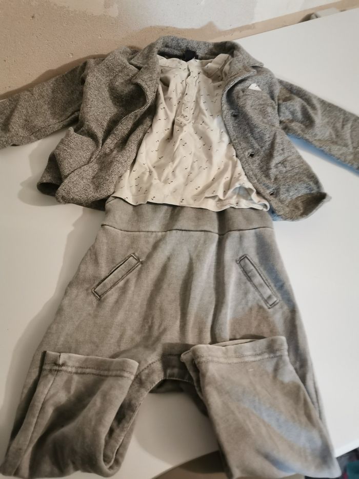Ensemble salopette gris avec veste grise et petite tee shirt note de musique