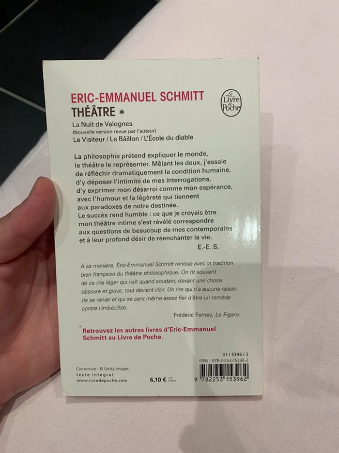 Eric-Emmanuel Schmitt Théâtre (La nuit de Valognes / Le visiteur / le Bâillon / L’école du diable) en très bon état