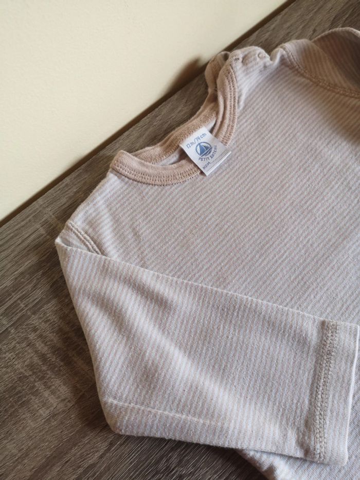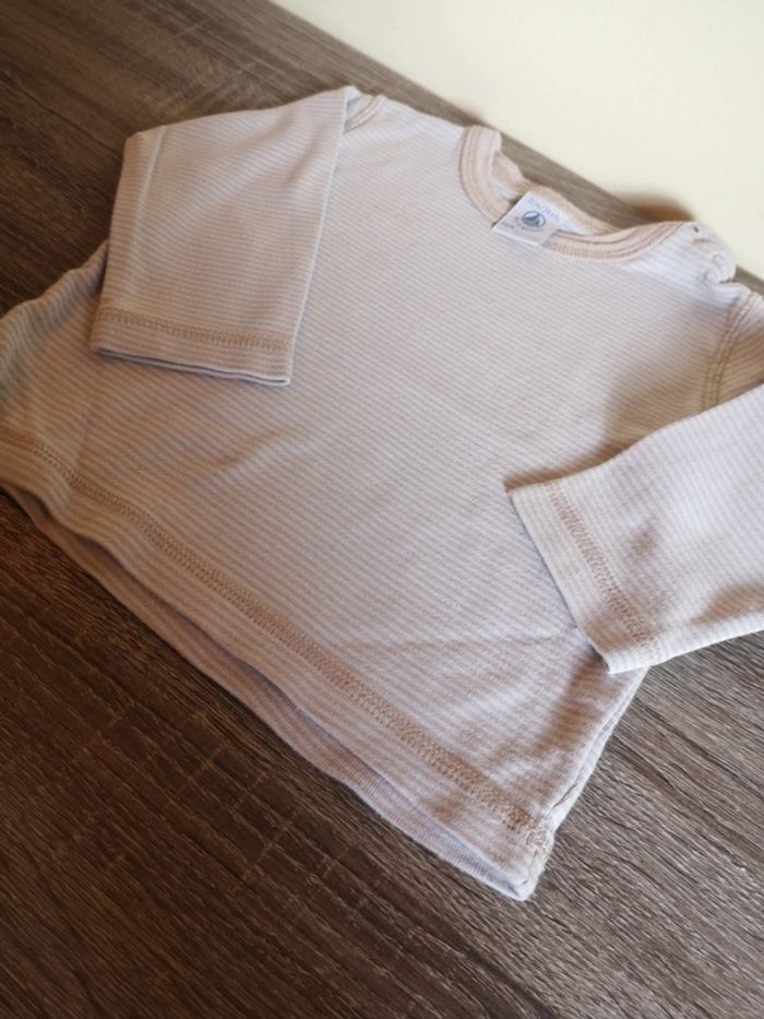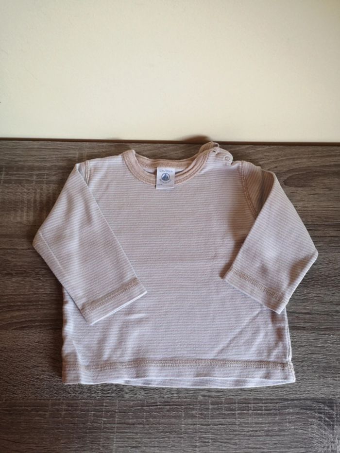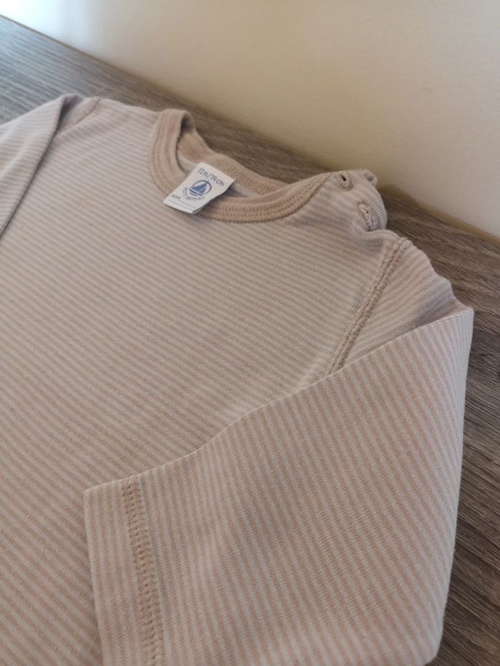 T-shirt à longues manches ligné en brun/beige et blanc Petit Bateau. Taille 12 mois mais taille comme un 9 mois (=74cm)
