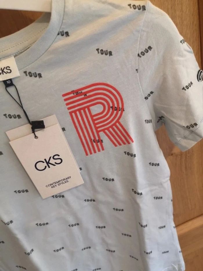 T-shirt à courtes manches CKS en bleu clair à imprimé noir et rouge. Taille 10 ans. Neuf #alexam_garcon10ans #cksgarcon10ans #tshirtgarcon10ans