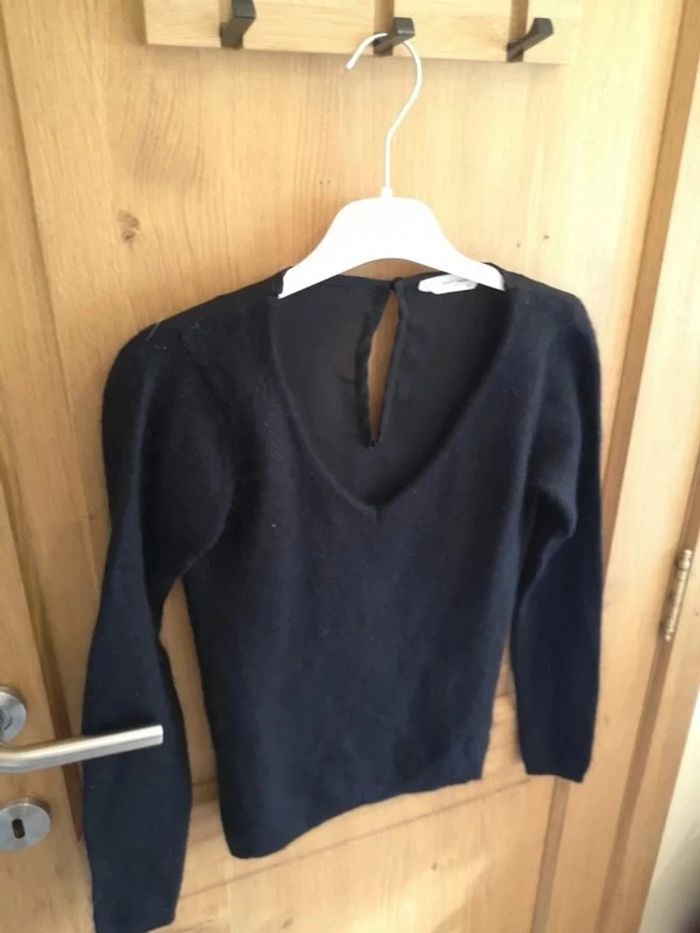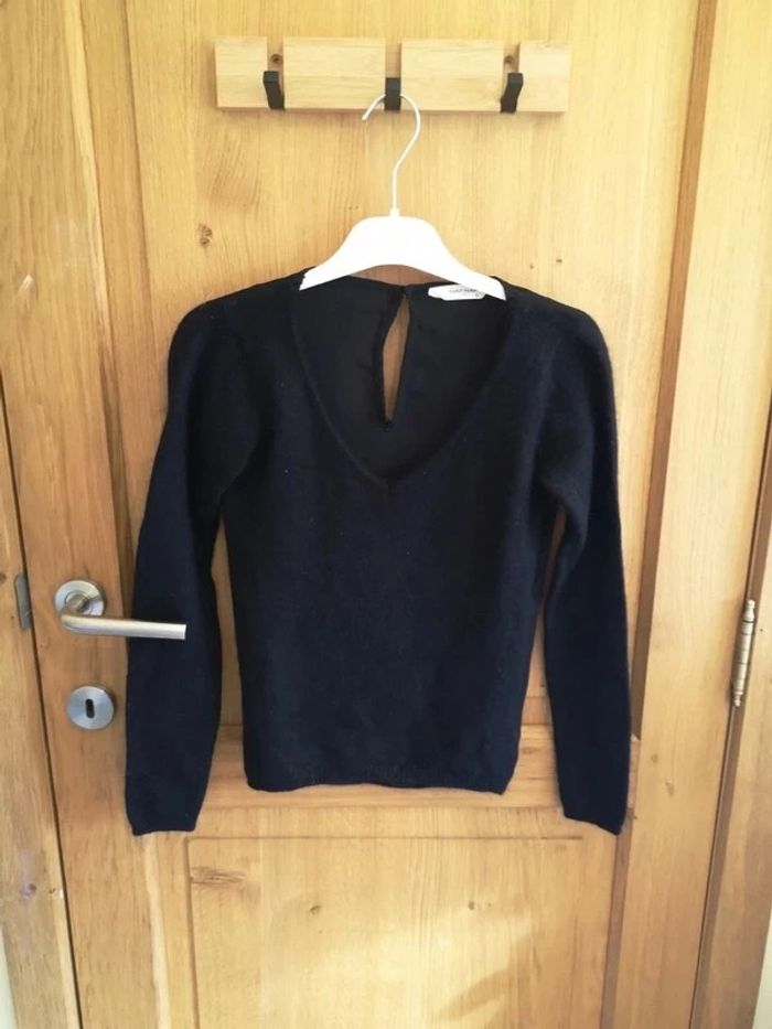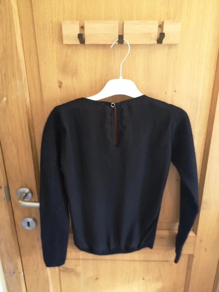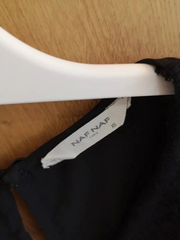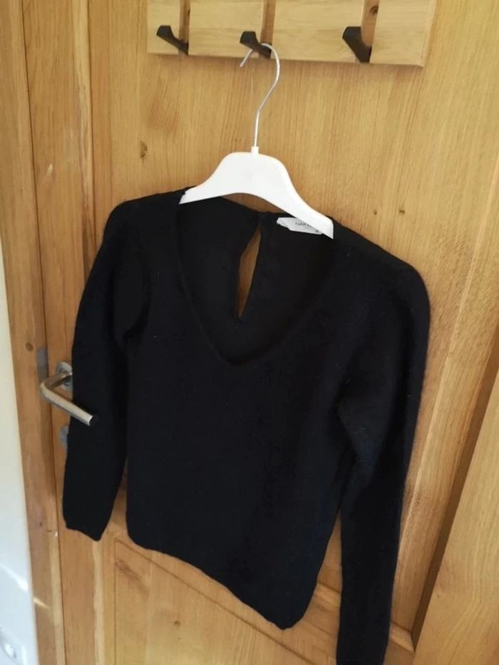 Pull court à longues manches naf naf en noir avec col en V. Effet voile à l'arrière. Taille xs #alexam_femmexs #nafnaffemmexs #pullfemmexs