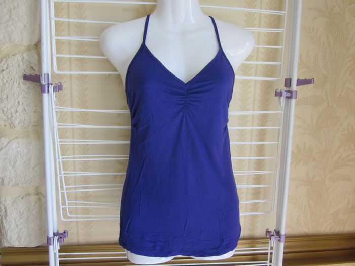 S, top bretelles, dos motifs dentelle et sequins, pimkie, la couleur est bien violette et non bleu comme il paraît sur la photo