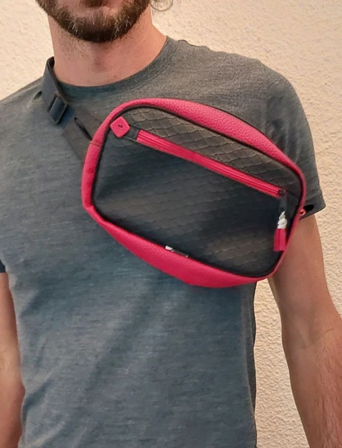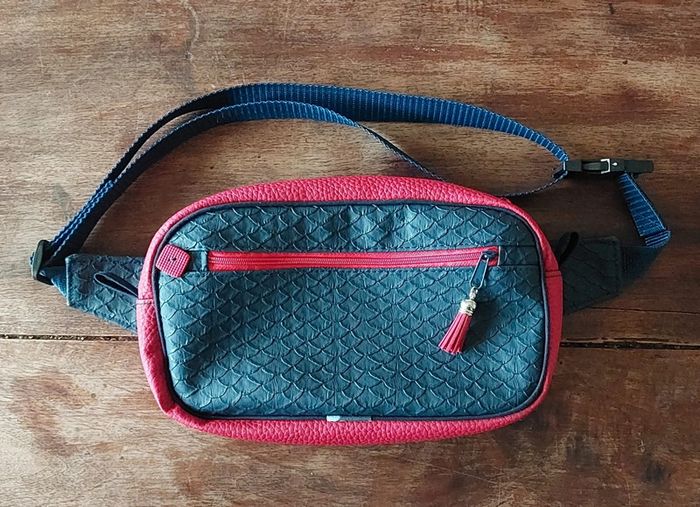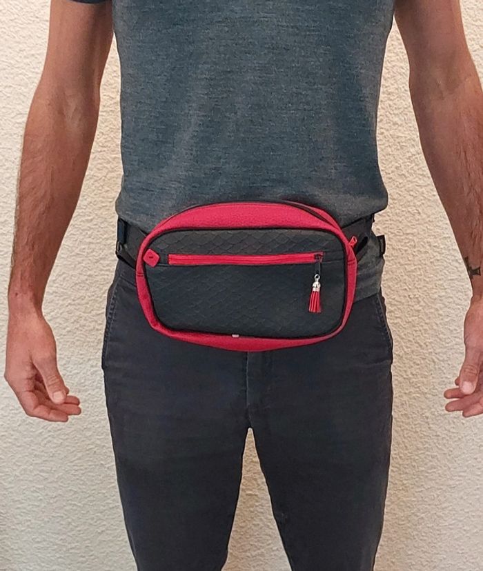 Banane sacoche EMEU A porté à la taille ou au buste. Parfait pour mettre ses papiers et ce qu'il nous fait au quotidien. La lanière se règle. Largeur : 23cm Hauteur : 12cm Profondeur : 6cm