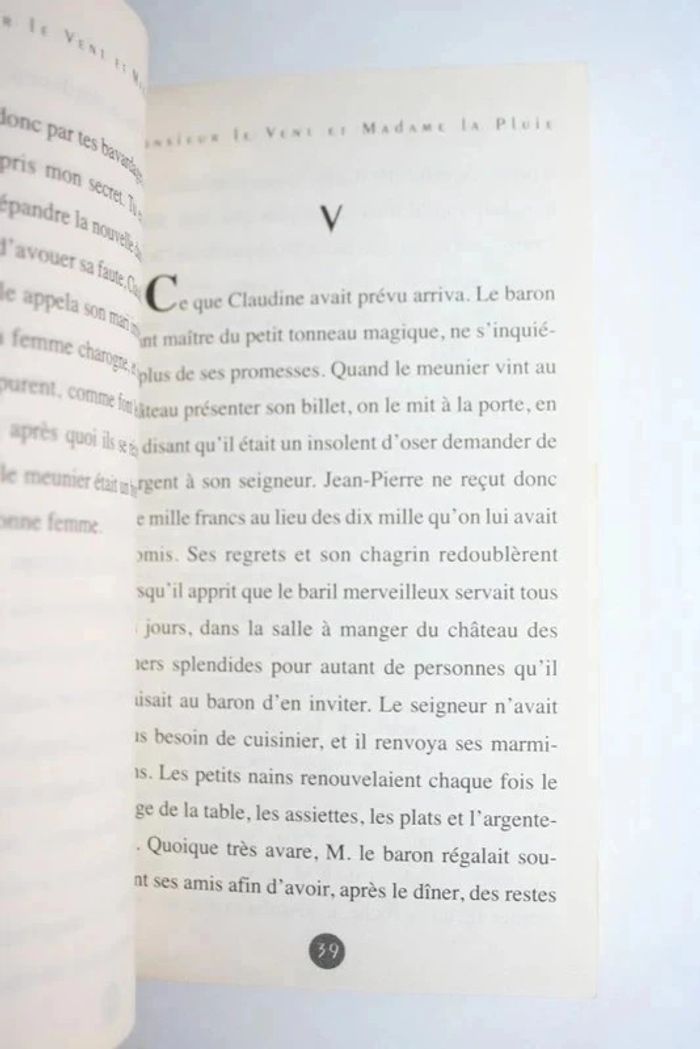 Monsieur le Vent et Madame la Pluie de Paul de Musset, usé sur la tranche et les coins + tâche sur la tranche cf photo, 125 pages, 100g Jean-pierre, le meunier, n'a pour tout bien que son moulin et son jardin potager. Mais jamais le vent ne fait tourner les ailes du moulin, et jamais la pluie ne fait pousser les légumes du jardin... jusqu'à ce qu'une nuit, M. le Vent et Mme la Pluie viennent se reposer dans la maison toute délabrée du meunier. Pour le remercier de son hospitalité, ils lui offrent deux objets magiques qui vont susciter la jalousie du terrible seigneur du château...