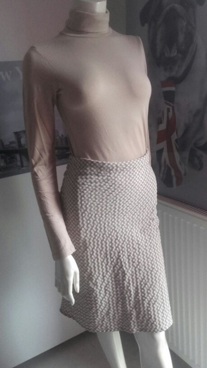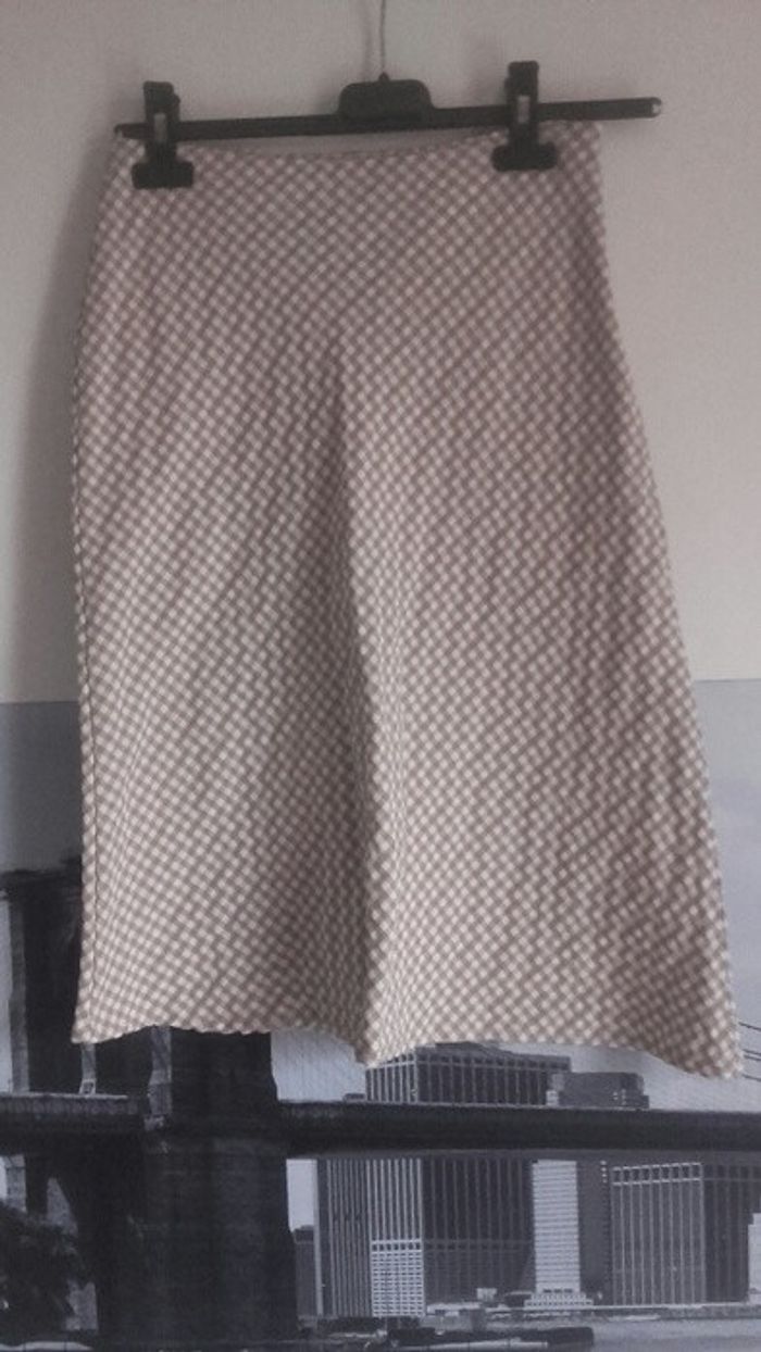 Jupe midi. Marque Mia Soana. État neuf car portée une fois. En matière floquee, beige a carreaux blancs. Très chic et également facile à porter en mode casual. #jupemidi #etatneuf #blancetbeige #carreaux #musthave #casualchic #printempsete2016