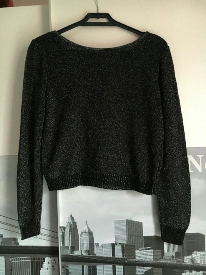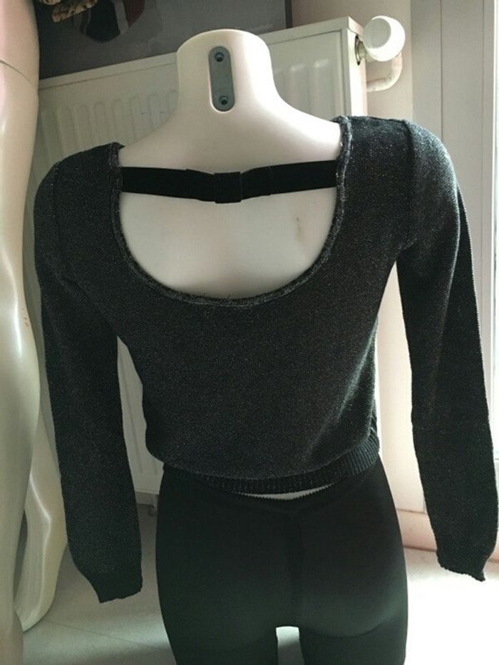 Petit pull de chez Cache Cache Neuf jamais porté. Noir avec des fibres argentés. Très original et sexy par son décolleté au dos rehaussé d'un détail noeud en velours. A porter sans modération les nanas