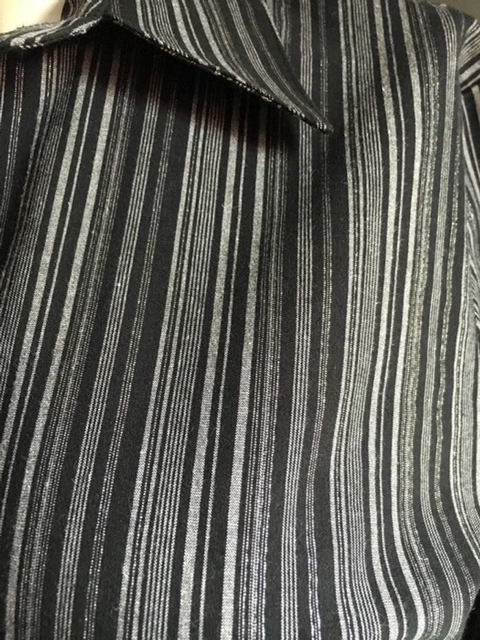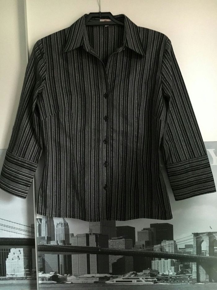 Chemise état neuf. Portée une fois ou deux maximum. A rayures, coloris noir gris et argenté. Cintrée et ajustée pour mettre le buste en valeur. Casual chic avec un slim denim.. plus glamour avec un pantalon de tailleur. #chemise #etat neuf #taille1 #noir #gros #argenté #lycra #musthave #Casual chic #toutessaisons