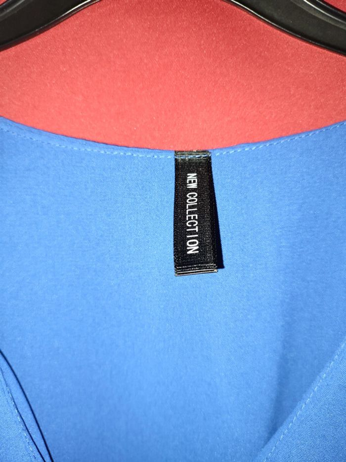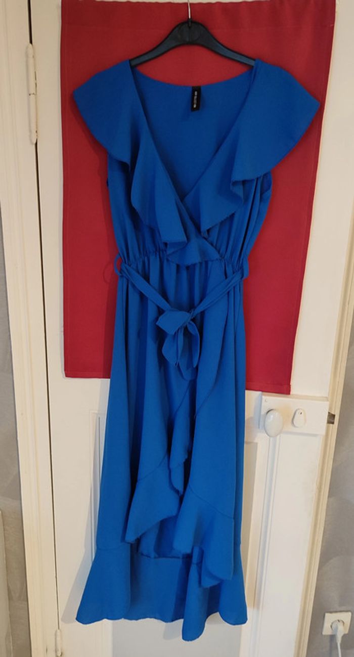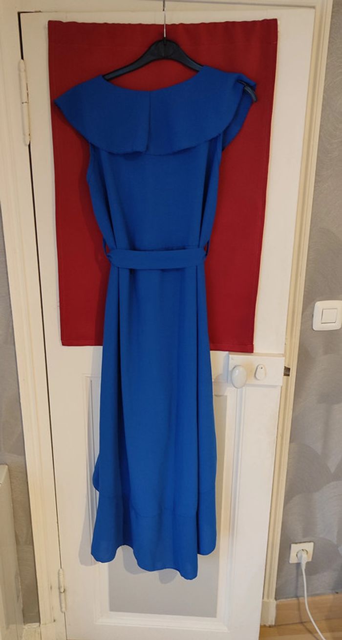 robe longue bleu electrique avec ceinture(possible de l'enlever)avec volants au col et tout le long de la robe 100% polyester New collection taille unique (du 36 au 42)