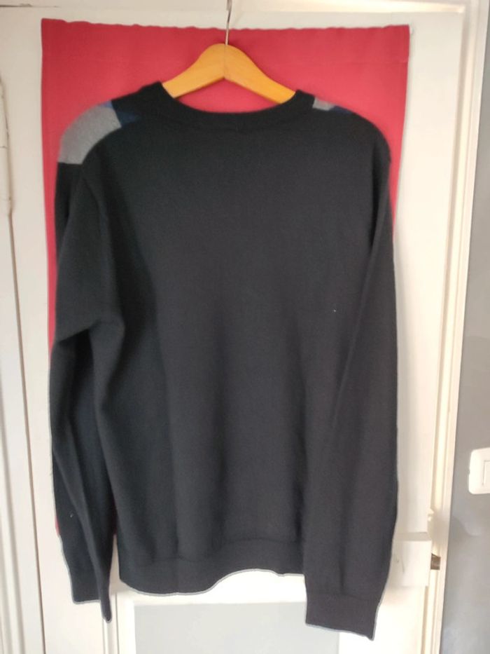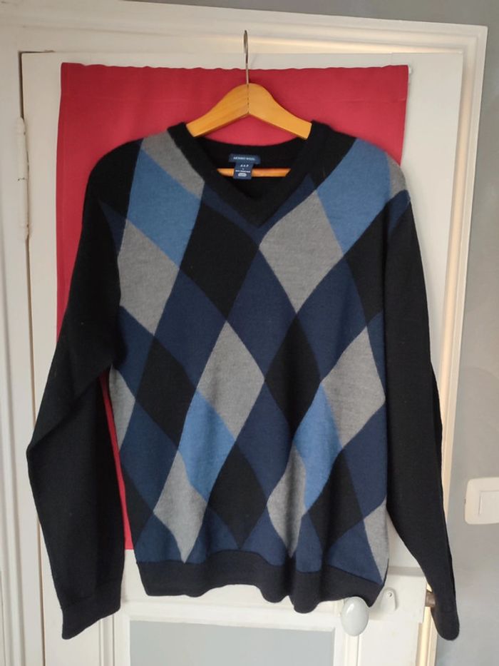 Pull noir impression losange gris et bleu 100 % laine mérinos Mesure sans tirer sur la maille: Largueur 55 cm Longueur 70cm Gap taille L