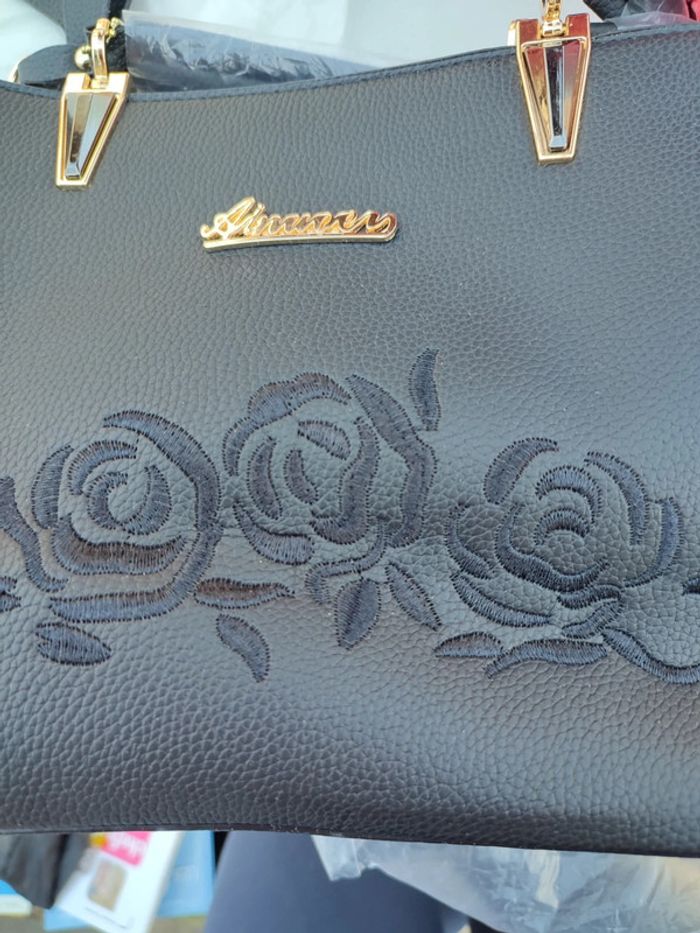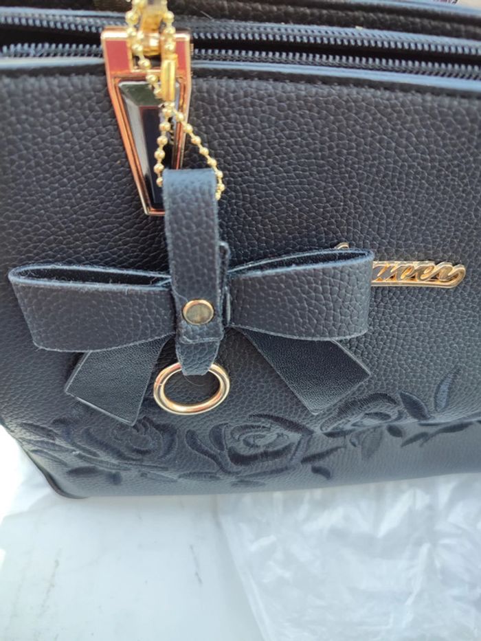 Sac noir NEUF bandoulière, fermeture éclair extérieure avec broderie en forme de rose. Décoration accrochée par une chaîne dorée en forme de nœud intérieur :fermeture éclair centrale et une sur le côté