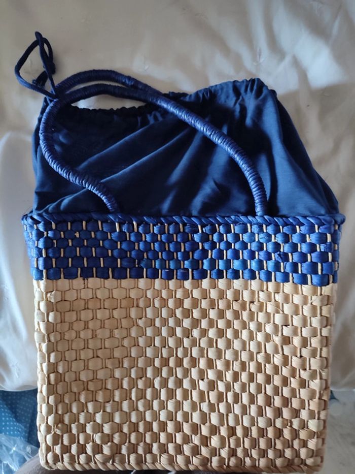 Sac en paille ,tissu intérieur bleu ferme par un lien