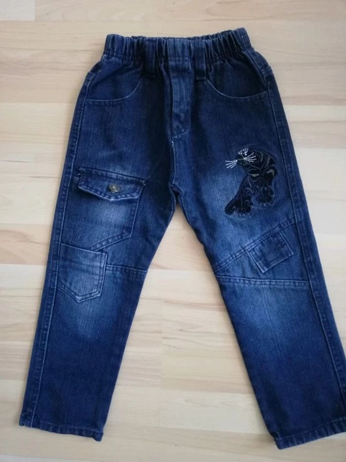 Jeans bleu taille élastique avec panthèrenoire sur la cuisse 6 ans