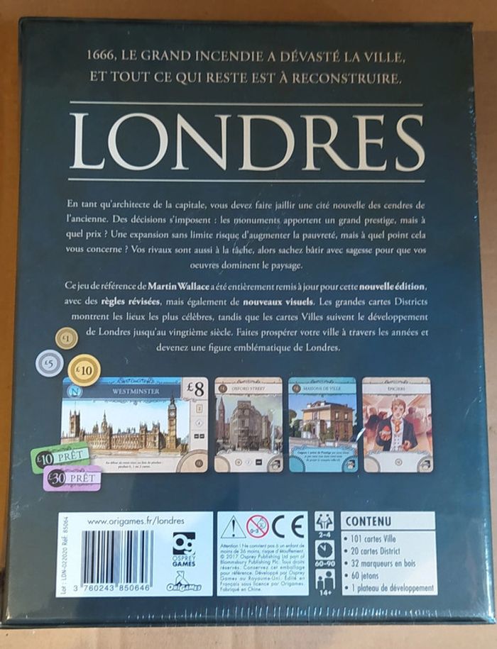 Jeu de société sous emballage - Prix Ferme Français à partir de 13 ans , 1 à 2h 2 à 4 joueur(s) Londres Le jeu « Londres » retrace la période allant du Grand Incendie de Londres en 1666 jusqu’au début du XXème siècle. Dans ce jeu, vous prendrez part à la reconstruction de la ville. Vous devrez gérer au mieux vos dépenses tout en faisant preuve de magnificence, sachant que vos points de victoire seront fonction de vos réalisations. Attention, cependant, à ne pas laisser la pauvreté ruiner vos efforts… Ce jeu est presque uniquement un jeu de cartes. Celles-ci sont divisées en trois paquets pour vous faire revivre, le plus fidèlement possible, les événements de l’Histoire. Vous placerez vos constructions sur une ligne exposée devant vous, sur la table. Les cartes, ainsi étalées dans votre zone de construction, vous procureront divers avantages, comme de l’argent, des points de victoire ou une réduction de la pauvreté. La plupart des cartes auront un effet lorsque vous restaurerez votre ville. Vidéo : https://www.youtube.com/watch?v=rOuEWqr9QWE Ludipresta
