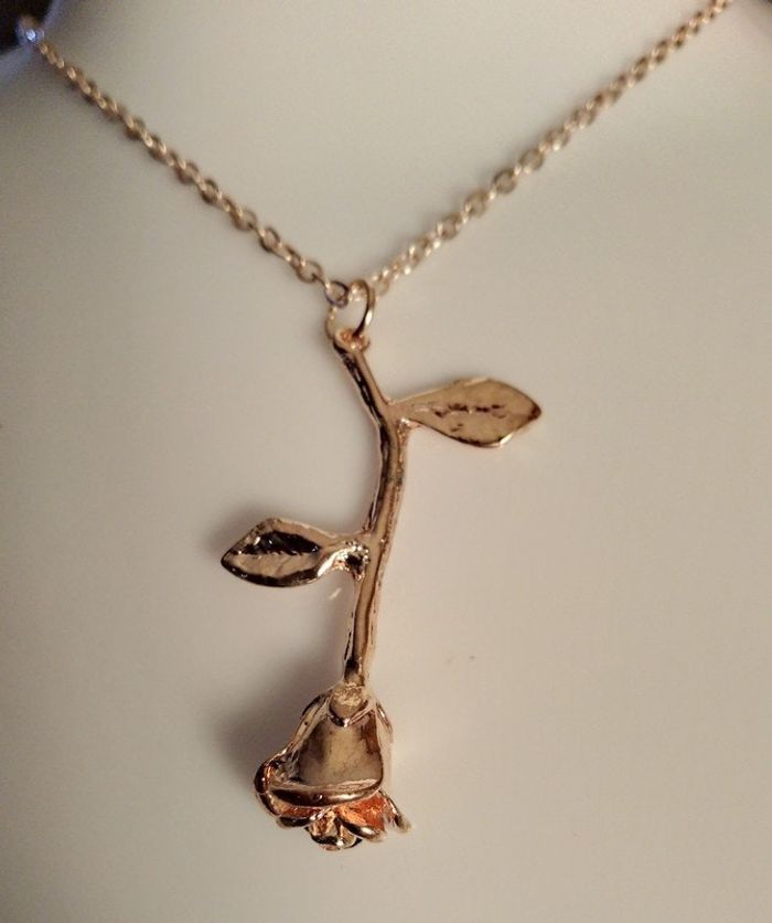 Chaine de 40 cms. Hauteur de la rose coloris or rose : 3.5 cms. Collier neuf sous blister. N'hésitez pas à regarder mes autres ventes. Envoi rapide et soigné.
