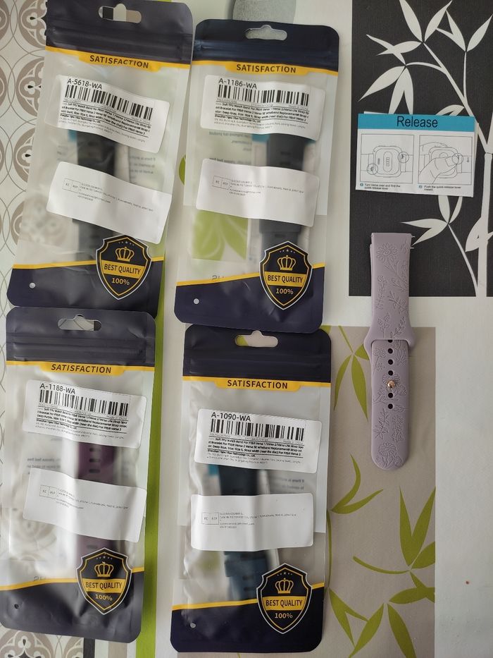 Vend bracelets pour Fitbit versa 2 achetés par erreur car j'ai la versa 3. Un gris, un noir, un violet foncé et un mauve à motifs.