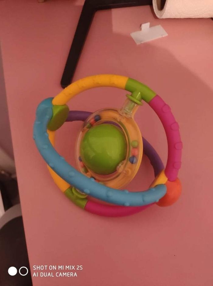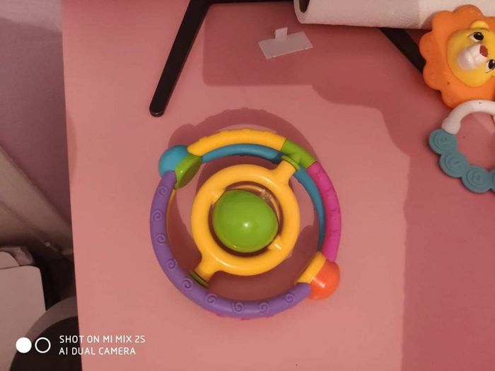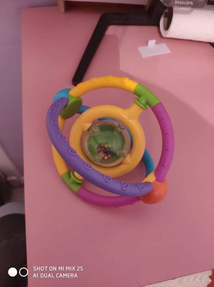 Hochet sphère qui fait du bruit quand on le secoue et la boule au millieu avec les billes tourne sur elle même. 6 mois et +