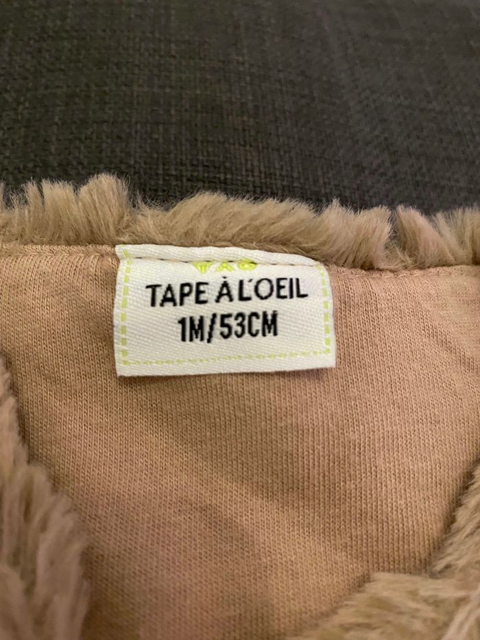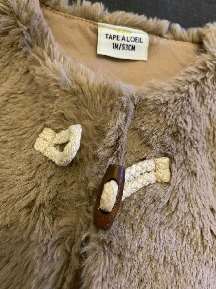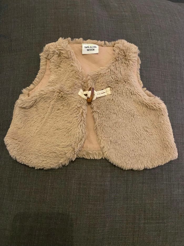 Vends gilet sans manche en fausse fourrure, Couleur brun Parfait état, porté 1 ou 2 fois seulement Taille 1mois Marque Tape à l’œil Prix: 3€