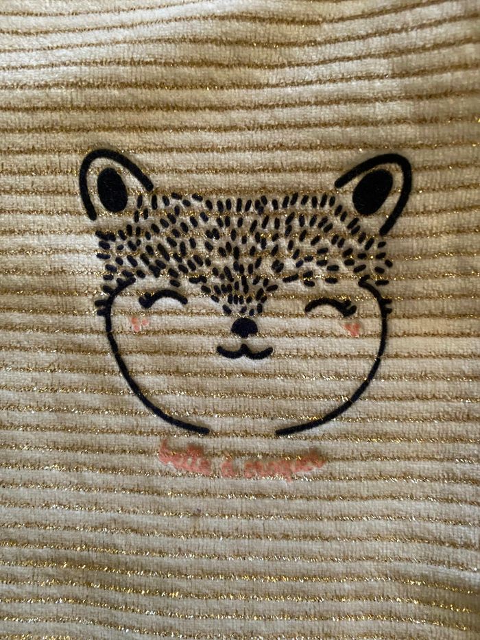 Vends pyjama bébé fille pailletée Motif et message, bleu marine et rose Très bon état: manque des paillettes sur la manche arrière droite Taille 1mois Marque Tape à l’œil Prix: 5€