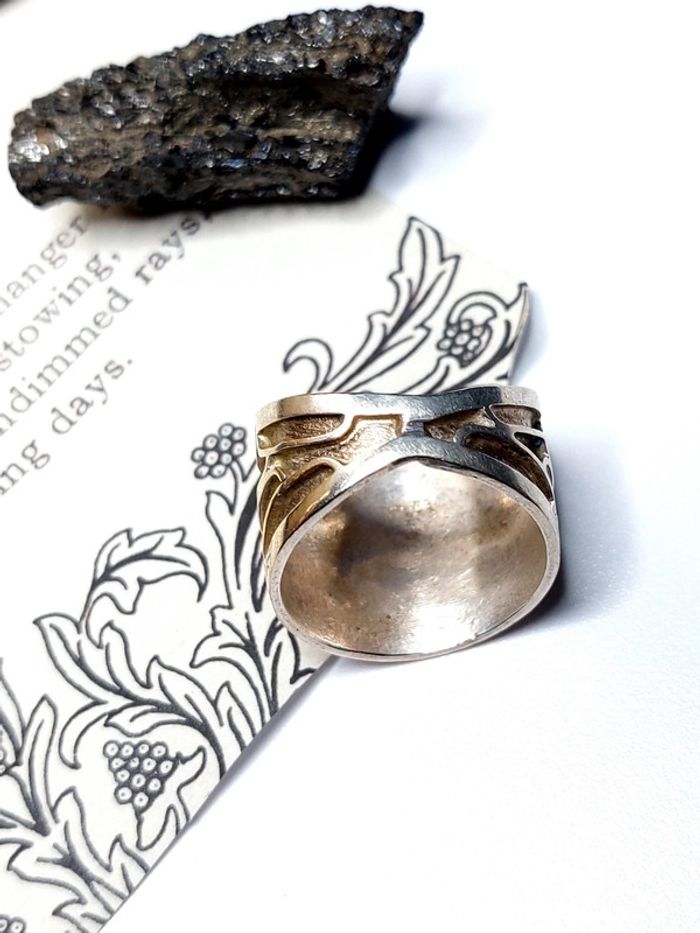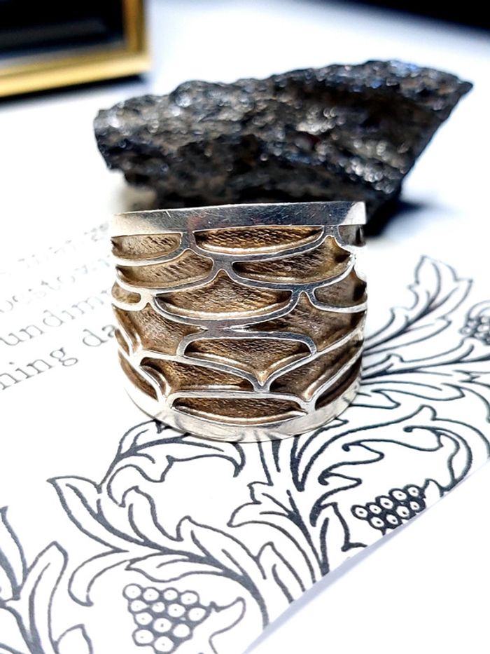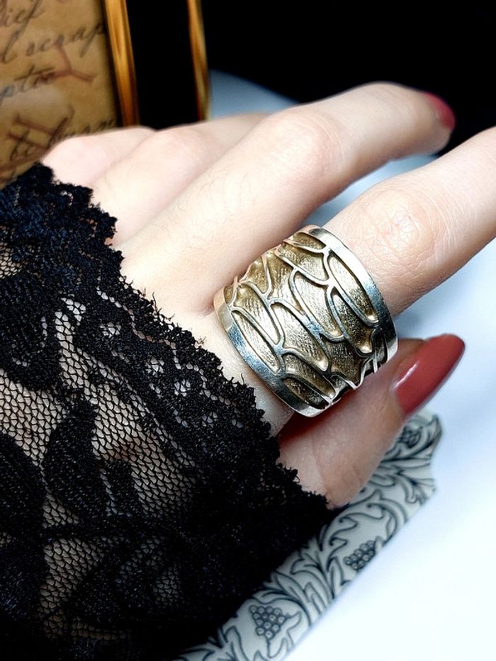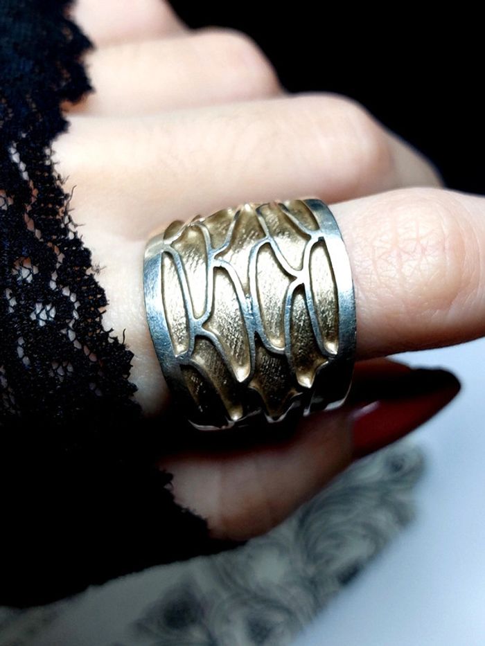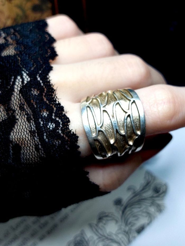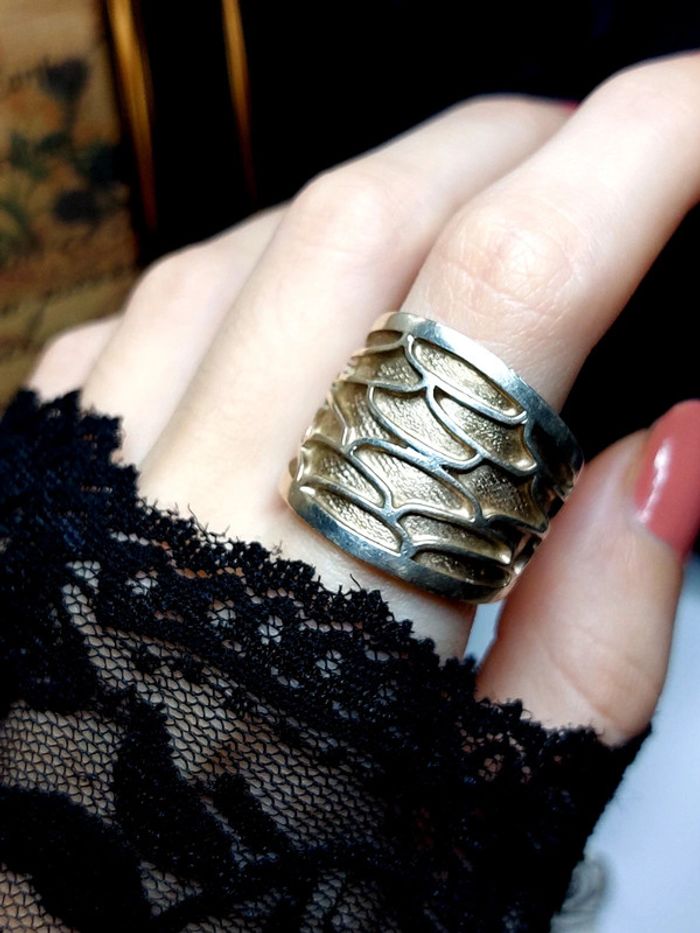Magnifique bague vintage taille 60, anneau epais avec relief. Couleur argenté et doré. Très bon état. Vintage Style ethnique. D'autres bijoux sont à découvrir dans mon dressing #bijouxsupernova 💙 Nous offrons 10% de réduction pour nos abonnés Instagram @caelifer_ ⚜️ Je suis disponible pour d'autres renseignements / ou demandes de lot. 💙 Les envois se font soit le jour même ou en 72h maxi ! Tags Vintage chic hippie 60's 70's 80's 90's 00's Y2k foulard soie collier bijoux fantaisie signature boucles d'oreilles bague bracelet manchette jonc parure pendentif médaille religieux ancien brocante antiguo antico juwelen bigiotteria joyería antigua antique antik vieux victorien belle époque 1920 art déco art nouveau 1930 années 50 lot gros lot lotto set carré friperie poinçon pièce rare argenté doré bronze perles strass