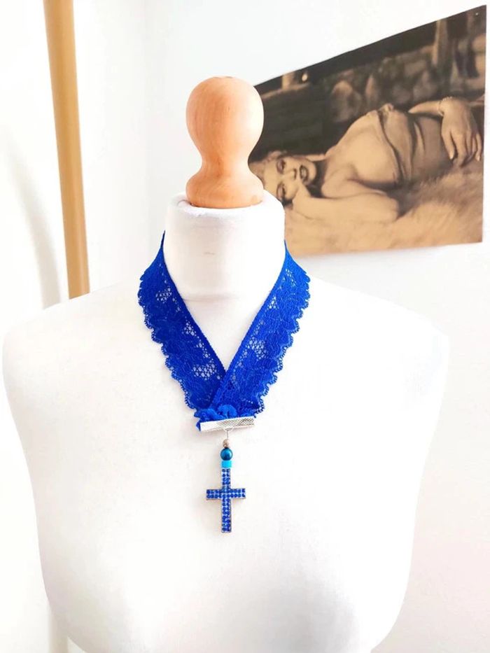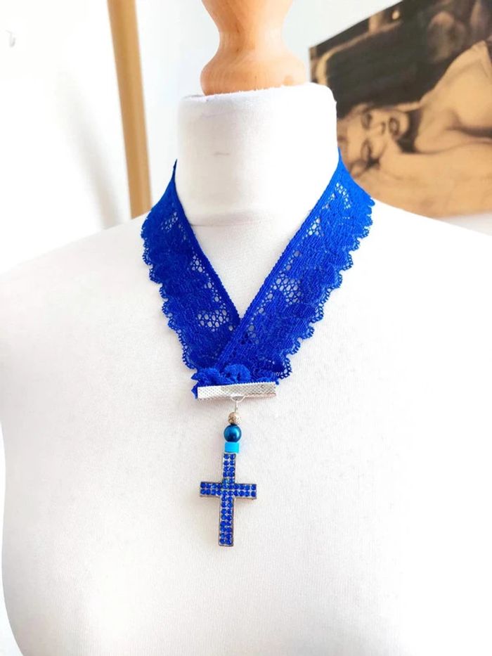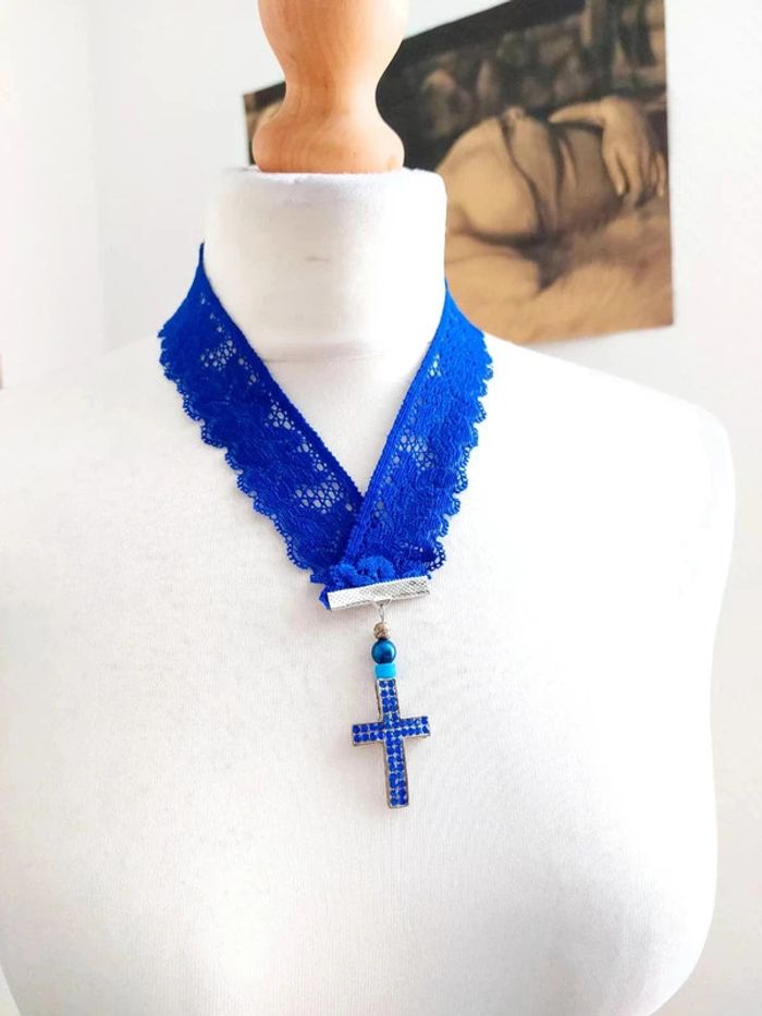 Collier bleu en dentelle avec pendentif croix - photo numéro 2