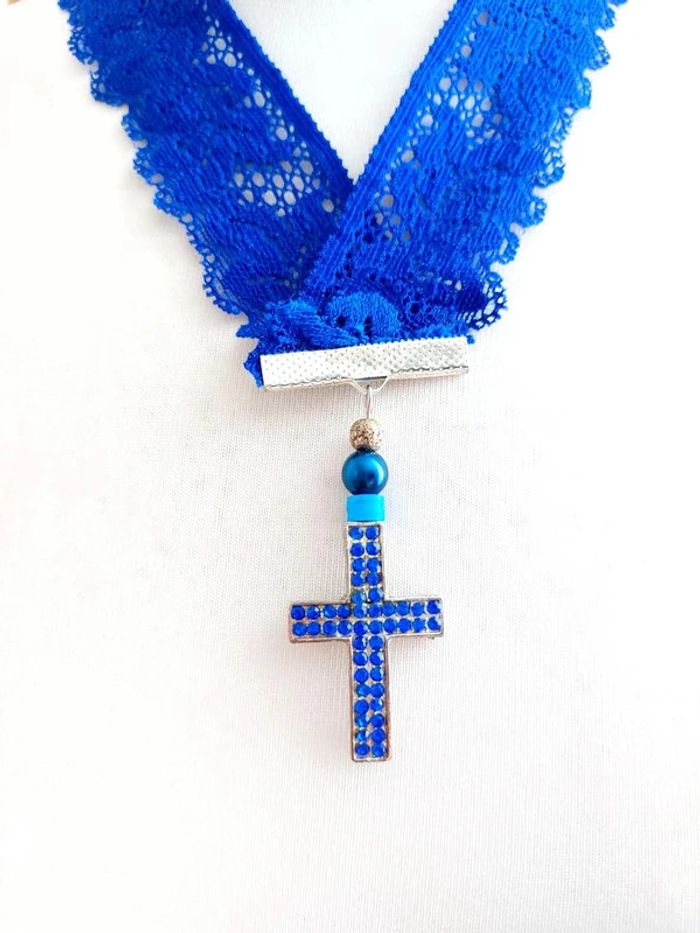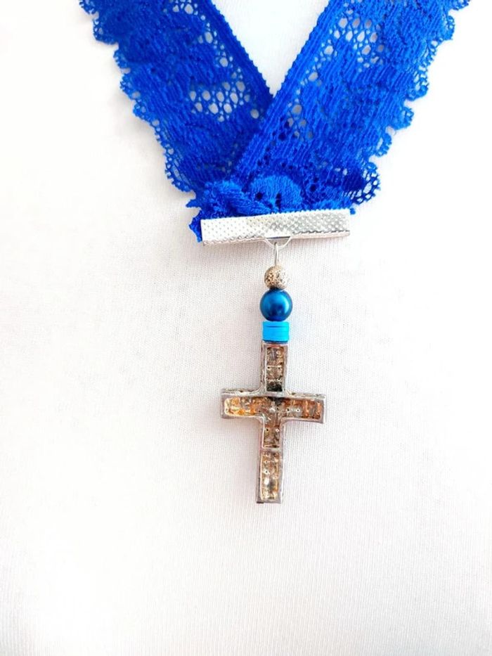 Collier bleu en dentelle avec pendentif croix - photo numéro 1