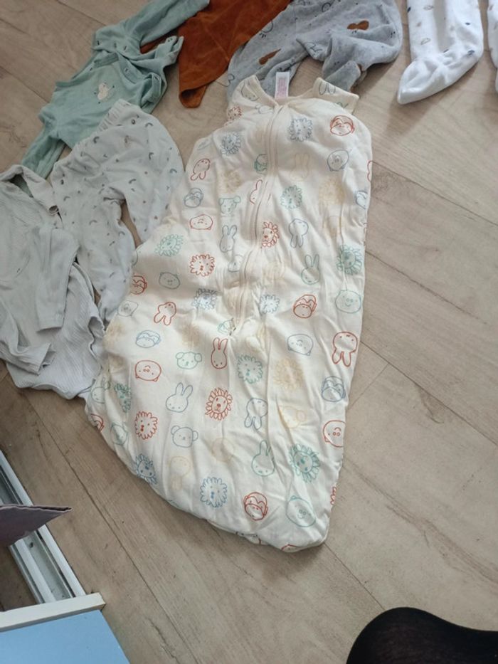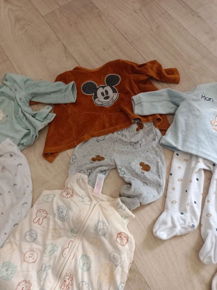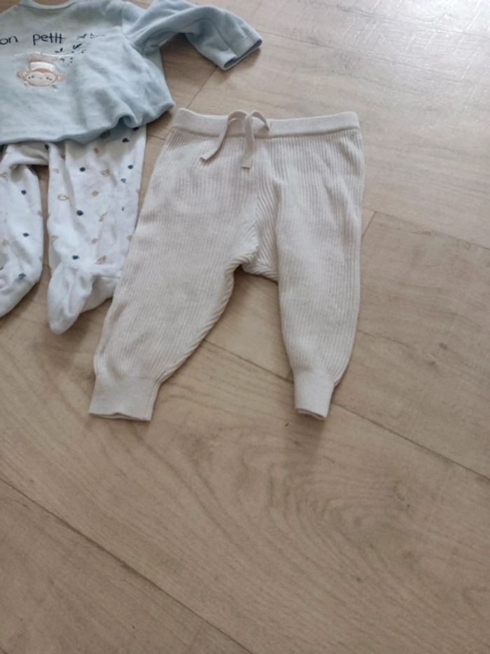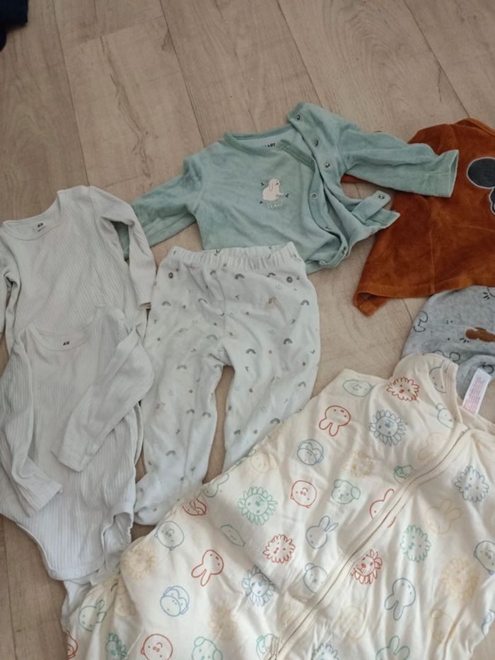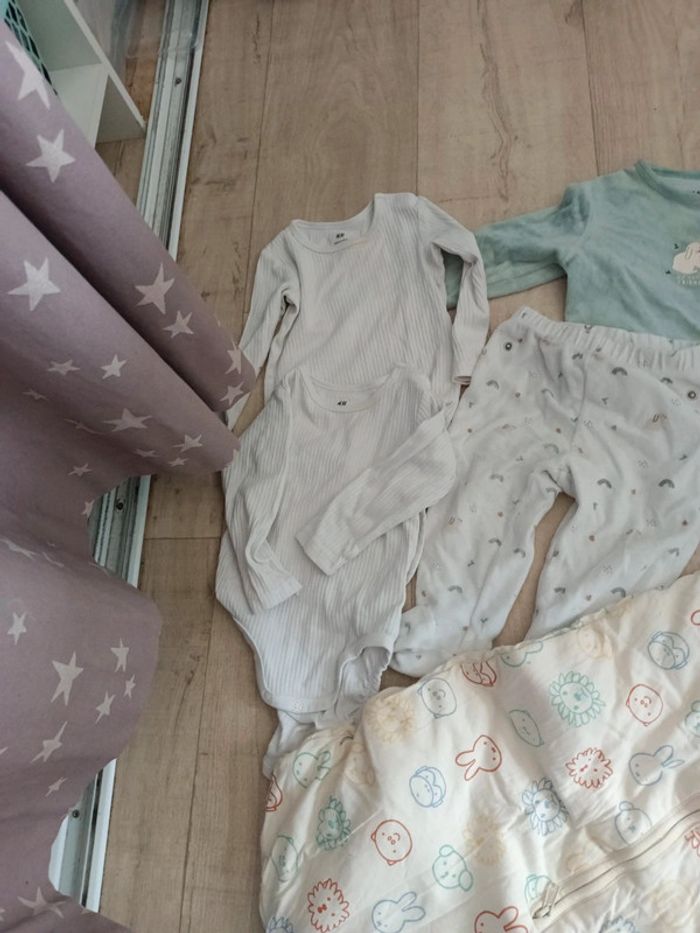 Les deux body sont un peu tachés h&m Gigoteuse parfaite état Trois pyjamas les 2 hauts bleu un peu taché Kiabi et Disney Sarouel Zara Taille 9 mois