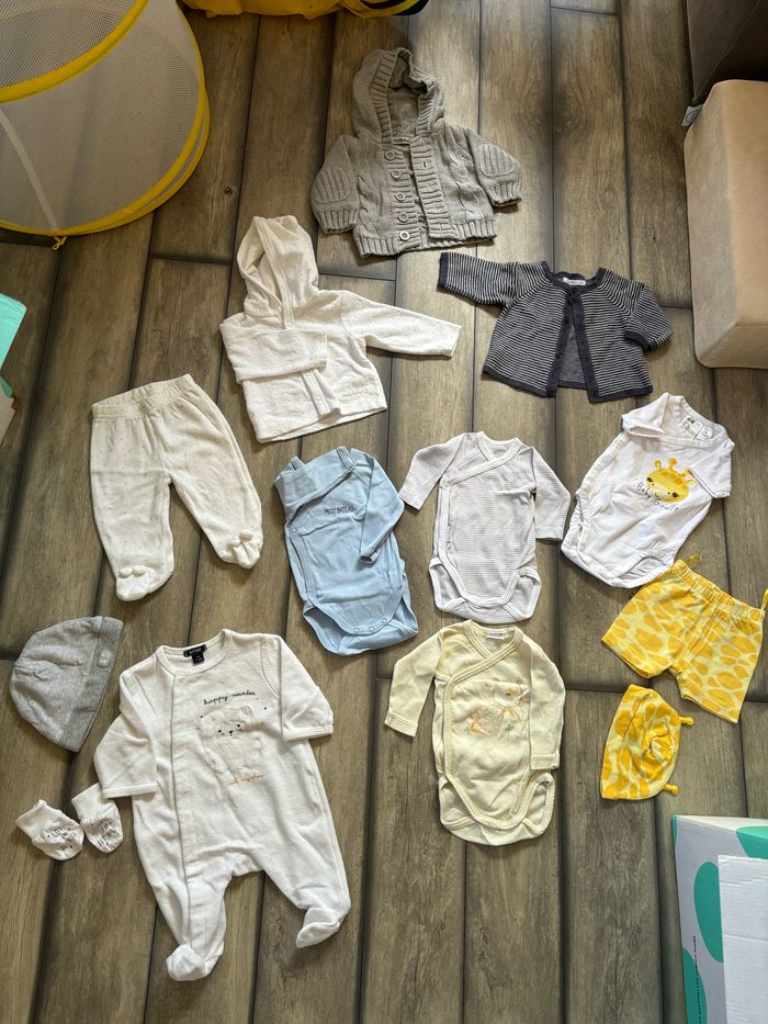 Gilet taille naissance TAO gris à capuche Gilet zippé blanc tout doux avec capuche baby club 1M Brassière bout chou marinière Ensemble H&M girafe 1M body+short+bonnet 3 bodys ML : petit bateau bleu 1M Absorba jaune 1M Blanc rayé gris p’tit bisous 1M Pantalon velours avec pied In extenso blanc 1M Pyjama mouton Kiabi 1M Bonnet vertbaudet Moufles Porté mais bon état