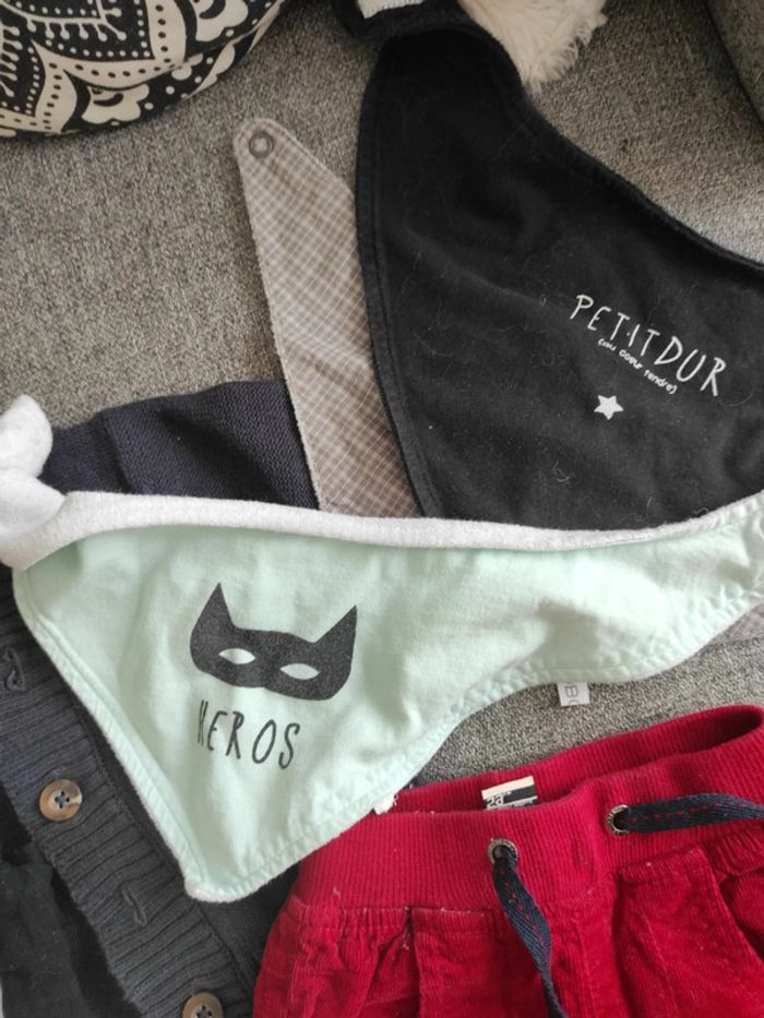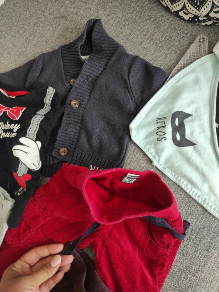 Gros lot taille 3 mois garçon Deux tee shirt manches longues comme neuf : un noir Disney baby , un TAO 3 pantalon : pantalon gris habillé mes petits cailloux, jogging bordeau Kiabi , pantalon rouge molletonné parfait pour l'hiver Un gilet a bouton TAO 3 bavoir de sorti Kiabi Le tout en parfait état Pour faire des lots ( réductions activés) #shadowstonem3mois