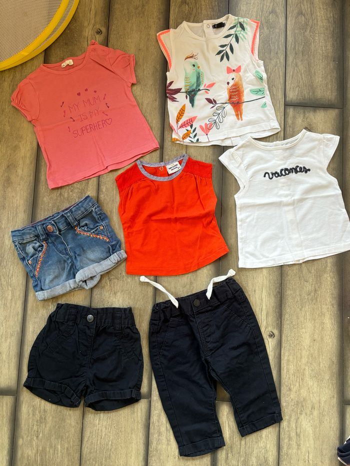 1 short bleu marine Kiabi 1 short jean TAO 1 pantalon léger Kiabi bleu marine 1 T-shirt corail TAO 2 t-shirts blanc Kiabi 1 t-shirt rose Kiabi TBE