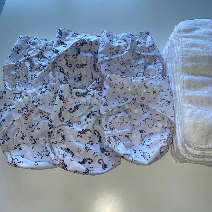 6 couches lavables neuves et 12 inserts neufs. Taille modifiable, motif mixte.