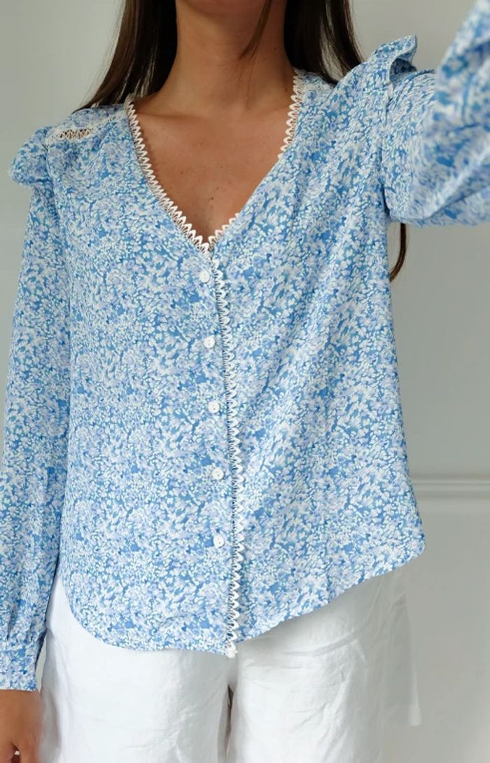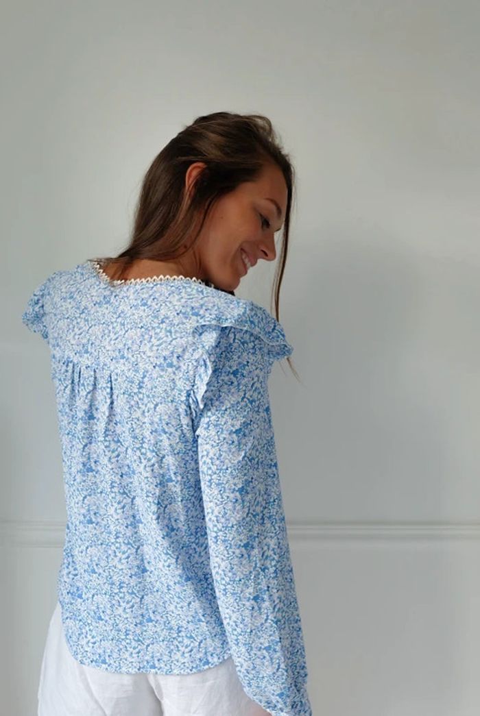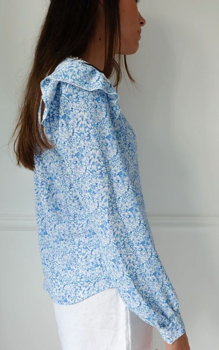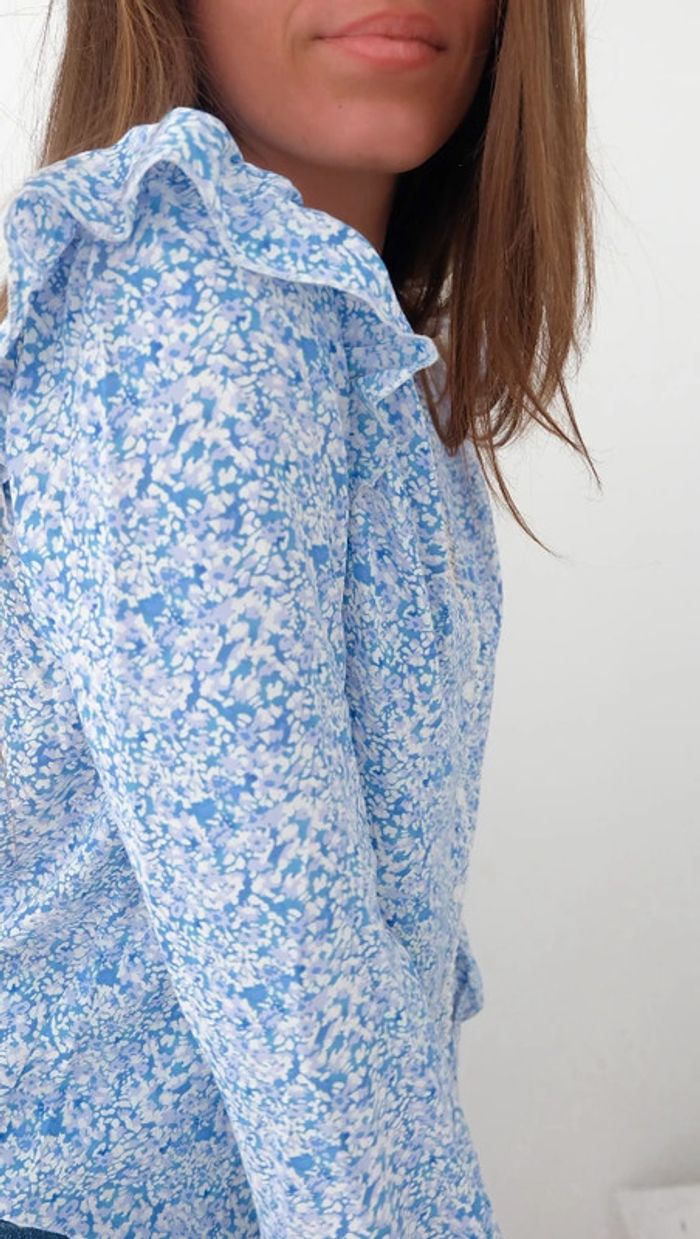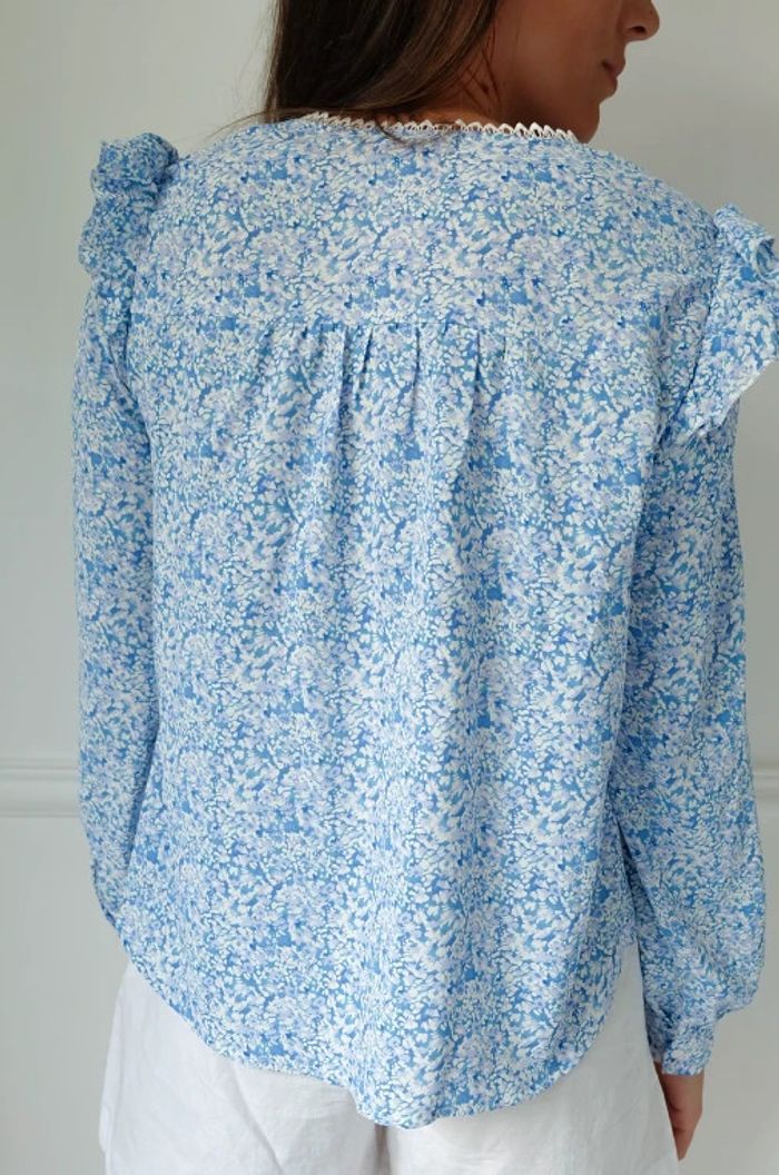 🌟 Blouse à fleurs bleu clair et blanche à volant - photo numéro 3