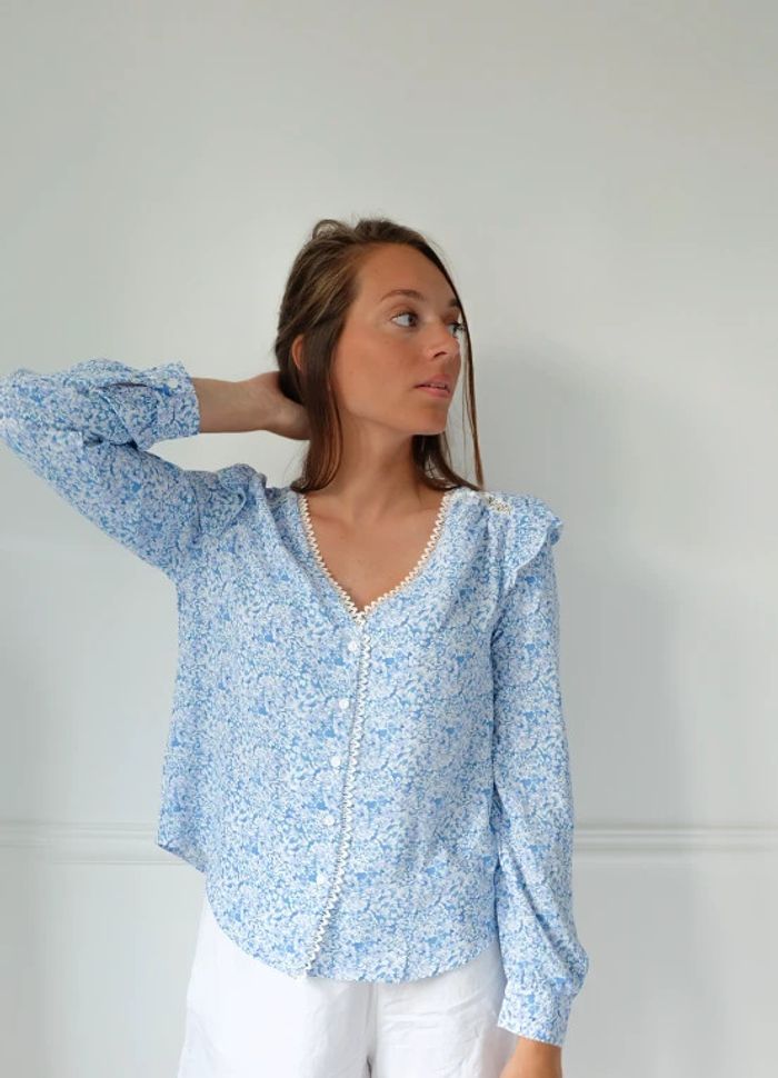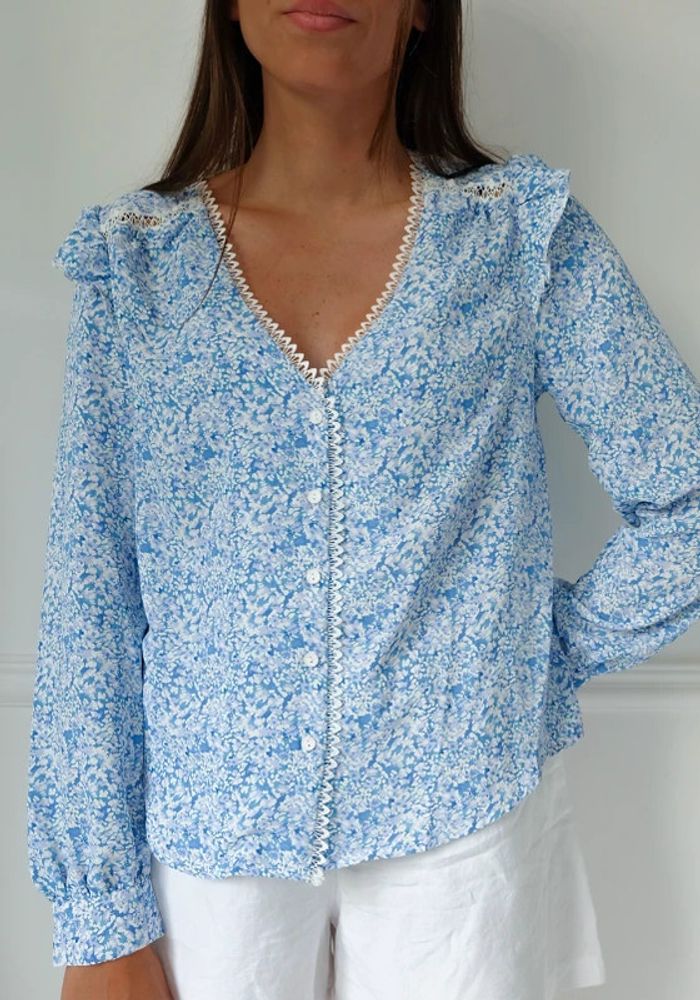 🌟 Blouse à fleurs bleu clair et blanche à volant - photo numéro 1