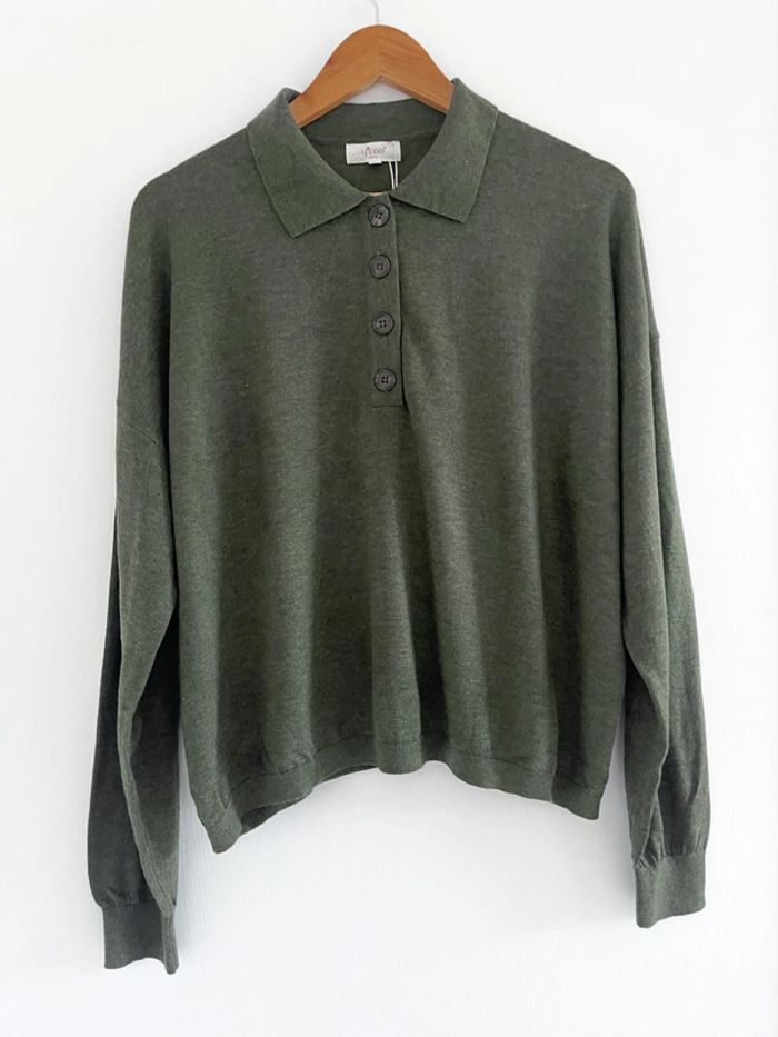 🌟 Polo manches longues kaki avec boutons marron - photo numéro 2