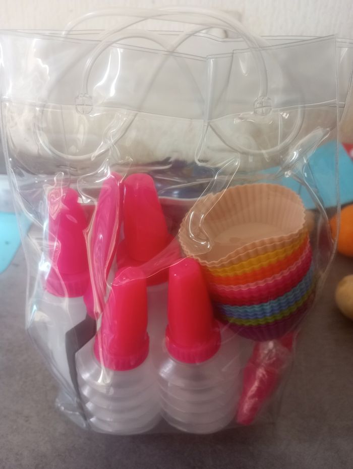 Dans son sachet kit pour pâtisserie spatule,5 bouteille avec différents modèles pour décoré un gâteau et 20 moules en silicone