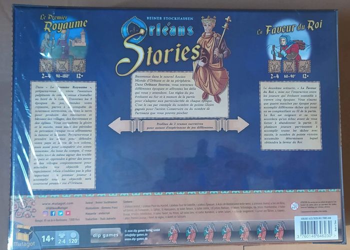Jeu de société sous emballage - Prix Ferme Français à partir de 14 ans 1 à 2h 2 à 4 joueur(s) Un jeu de bag-building comportant de nombreux défis Orléans Stories est basé sur le mécanisme de bag-building connu d'Orléans. Celui-ci s'est développé pour devenir une expérience narrative dans laquelle les joueurs traversent différentes époques et sont confrontés à différents défis. Dans Orléans Stories, les joueurs ne se concentrent plus uniquement sur la ville d'Orléans et le commerce avec les villages environnants, mais s'installent maintenant dans la vallée de la Loire. Les joueurs devront cultiver et produire, fonder des villages et construire des forteresses et des églises. Ils connaîtront des périodes de prospérité et de succès, mais aussi des périodes de privation. Ils devront défier la faim et la peste, lutter pour leurs terres et peut-être conquérir des terres étrangères pour protéger la vie de leurs colons. La faveur du Roi Plus courte, cette histoire est plus simple et plus appropriée comme introduction au jeu. S'étendant sur cinq ères, vous devrez effectuer de nombreuses tâches, dont certaines devront être accomplies avant la fin de chaque ère. Ceux qui n'y parviendront pas, seront laissés à l'abandon. Cette menace d'avoir à terminer le jeu prématurément procure un frisson constant. Les tâches seront seront également comparées dans le château du roi, où des points de victoire seront attribués aux joueurs en fonctions de leurs réalisations. Vidéo : https://www.youtube.com/watch?v=sZnd9kkMkLA&ab_channel=DeludiK Ludipresta