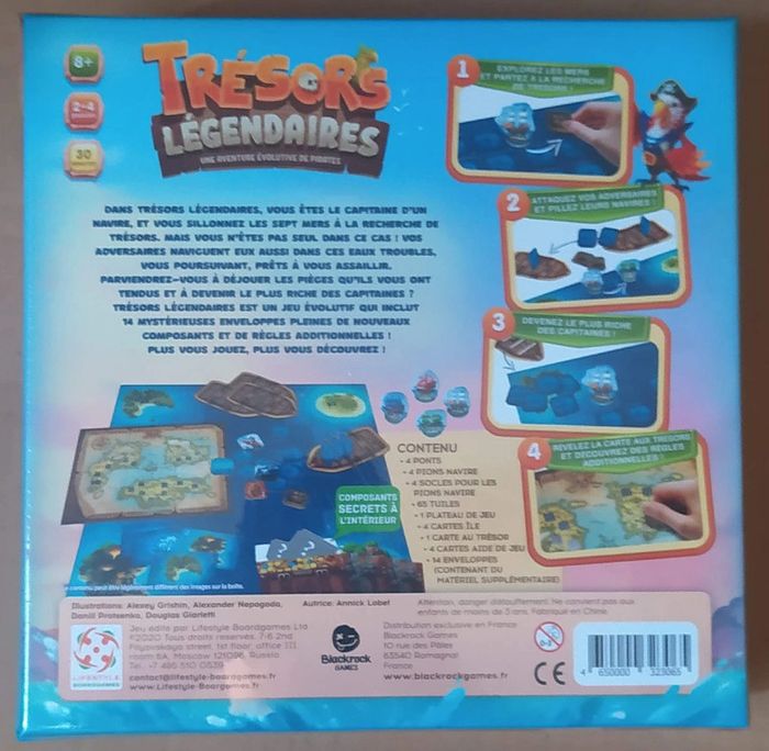Jeu de société sous emballage - Prix Ferme A partir de 8 ans 2 à 4 joueurs 30 - 45 min Découvrez Trésors Légendaires de Lifestyle, un jeu de Collection pour 2 à 4 joueurs à partir de 8 ans. Dans Trésors Légendaires - Une aventure évolutive de pirates, vous êtes les capitaines d'un navire et vous allez vivre de nombreuses aventures sur les mers et dans des îles. Découvrez les mystères que renferment les enveloppes et soyez le plus malin pour voler et cacher vos trésors ! Les joueurs reçoivent secrètement en début de partie une île. Ils devront y cacher un maximum de tuiles trésors pour remporter la partie. Les joueurs peuvent effectuer 3 actions parmi les suivantes : 1) Explorer - Déplacer leur navire d'une case et récupérer des tuiles du plateaux, qu'ils posent sur leur Pont. 2) Se déplacer - Déplacer leur navire de deux case sans récupérer de tuile. 3) Décharger - Décharger des tuiles de leur Pont sur une île. 4) Attaquer - Défausser des tuiles Canons pour attaquer des Navires adverses et récupérer les tuiles de leur Pont. 5) Échanger des cartes îles. 6) Jouer une tuile spéciale. Une fois la partie terminée, le gagnant pour découvrir un Trésor sur la carte aux Trésors à gratter et déverrouillera des enveloppes pour tout le monde. De nombreuses surprises vous attendent. Vidéo : https://youtu.be/wOoQ0ybIAlc Ludipresta