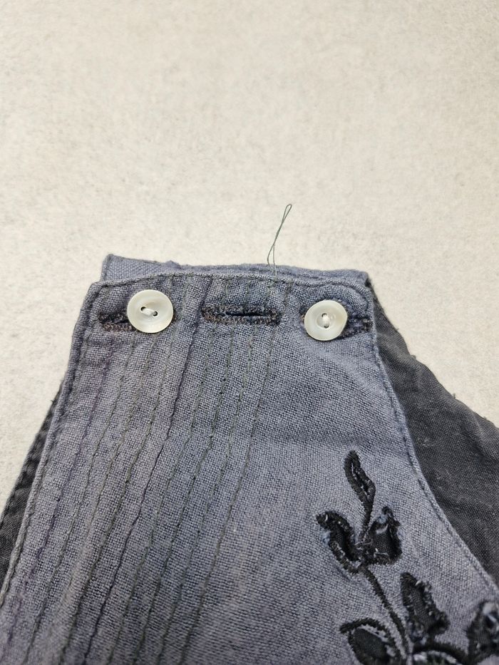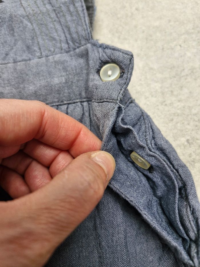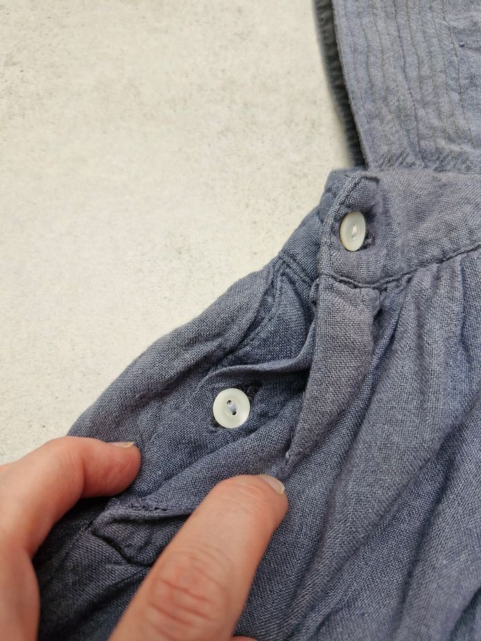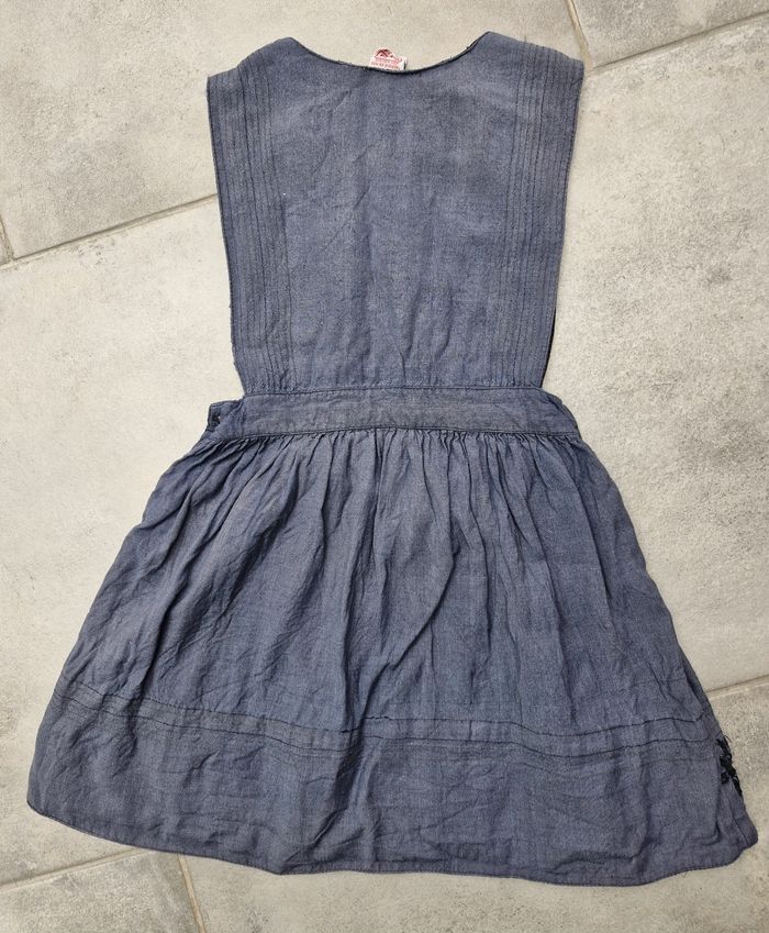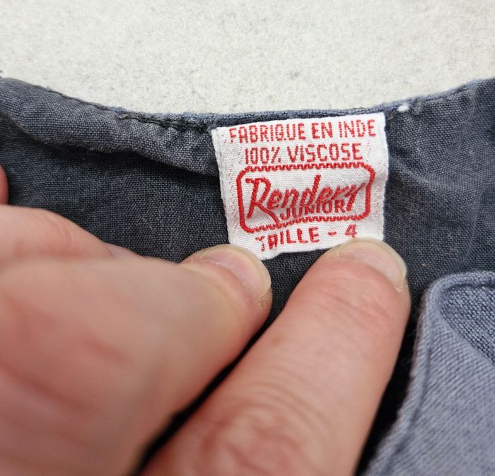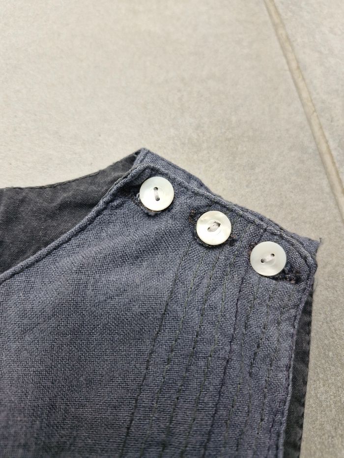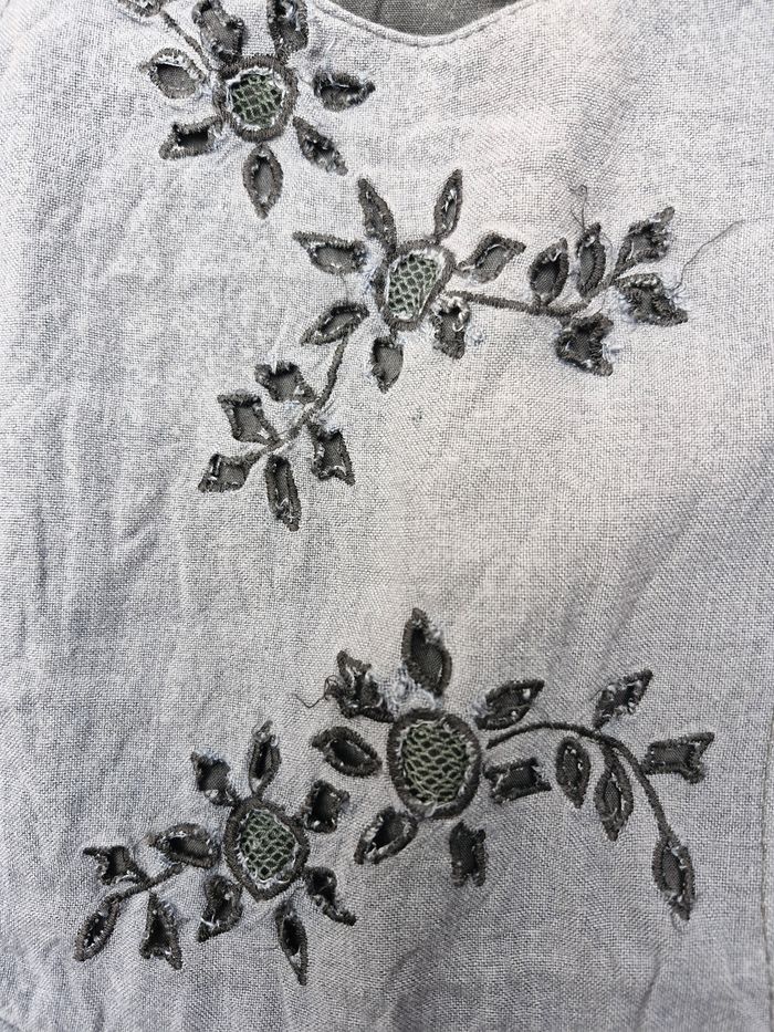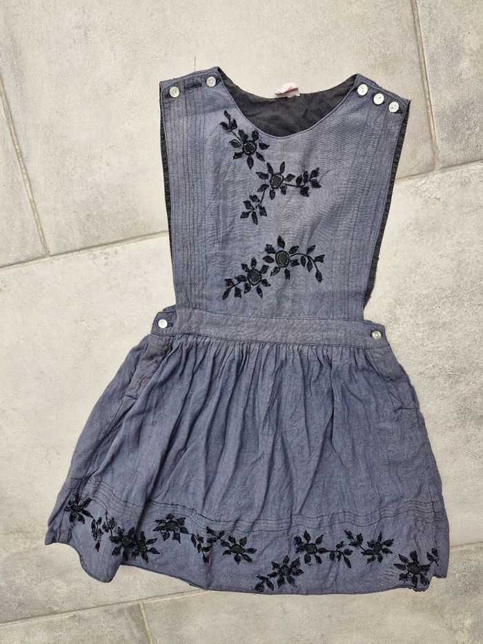 Les fleurs sont joliment découpées et les contours brodés dans la 1ère épaisseur du tissu. Certaines ont les contours moins bien définis car certains fils sont un peu abîmés (photo 2). Initialement 3 boutons nacrés sur chaque épaule mais 1 manquant sur l'épaule Droite (photo 5). 100% viscose. Robe doublée mais idéale printemps ou été car légère. Tons bleu gris. Marque Rendery Junior