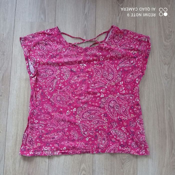 Joli effet lacets dos. Le rouge n' est pas vif. Mesures prises à plat : aisselles : 53cm. C5