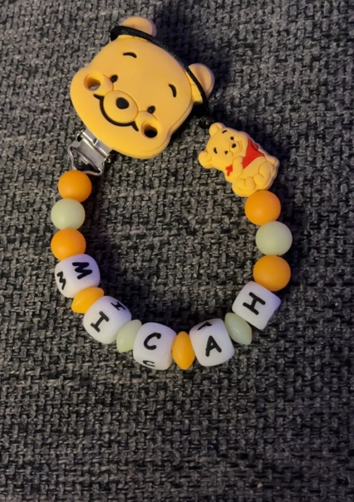 Attache tétine personnalisé en silicone ou en bois au souhait de l’acheteur . Personnalisable au choix de l’acheteur que ce soit la couleur comme le prénom ou le thème . Le fil est doublé pour plus de sécurité tout le long de l’attache tétine. N’hésitez pas à me demander et regarder mon dressing. Une photo vous sera envoyée avant l’expédition pour vous ayez un aperçu du rendu. Tous les produits sont réalisés avec du materiel spécial conçu aux bébés , enfants.