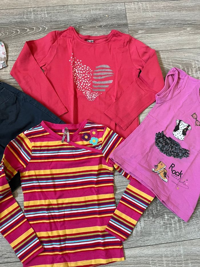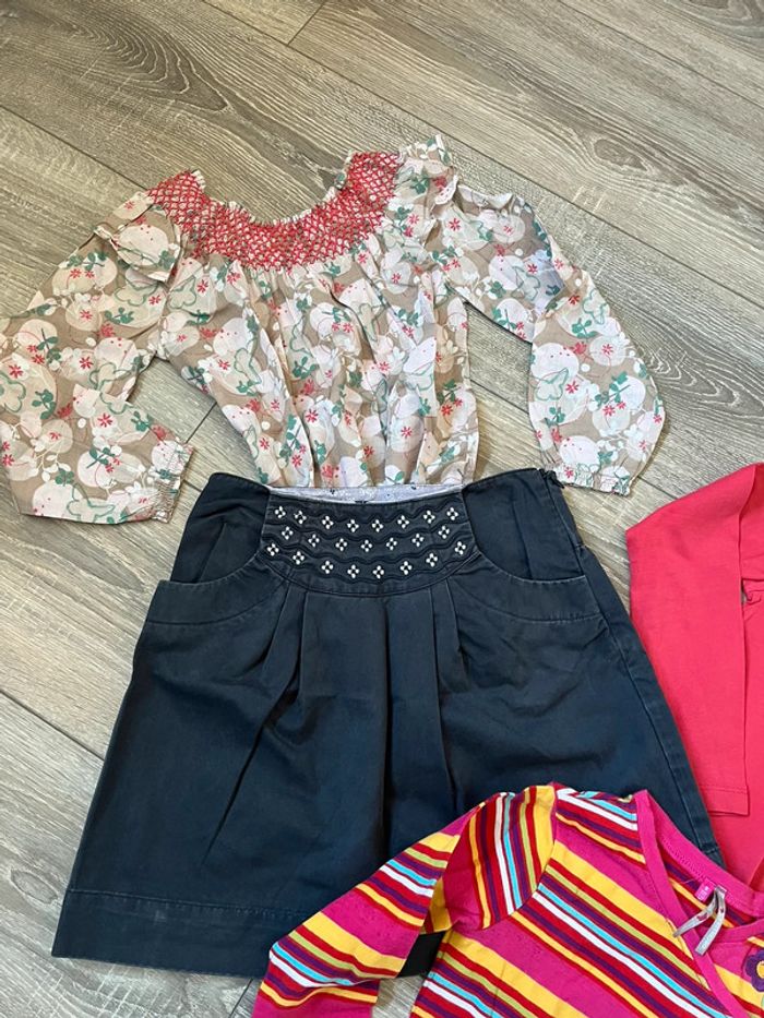 Très bon état Une jupe, 1 blouse, 2 t-shirt manches longues et 1 manches courtes Plusieurs marques : orchestra, tape à l’œil, Lily rose Autres vêtements fille visibles ici #5ansfilleraphnoe #lotfille5ans #tshirtfille5ans