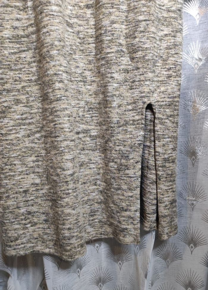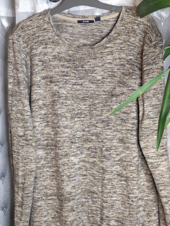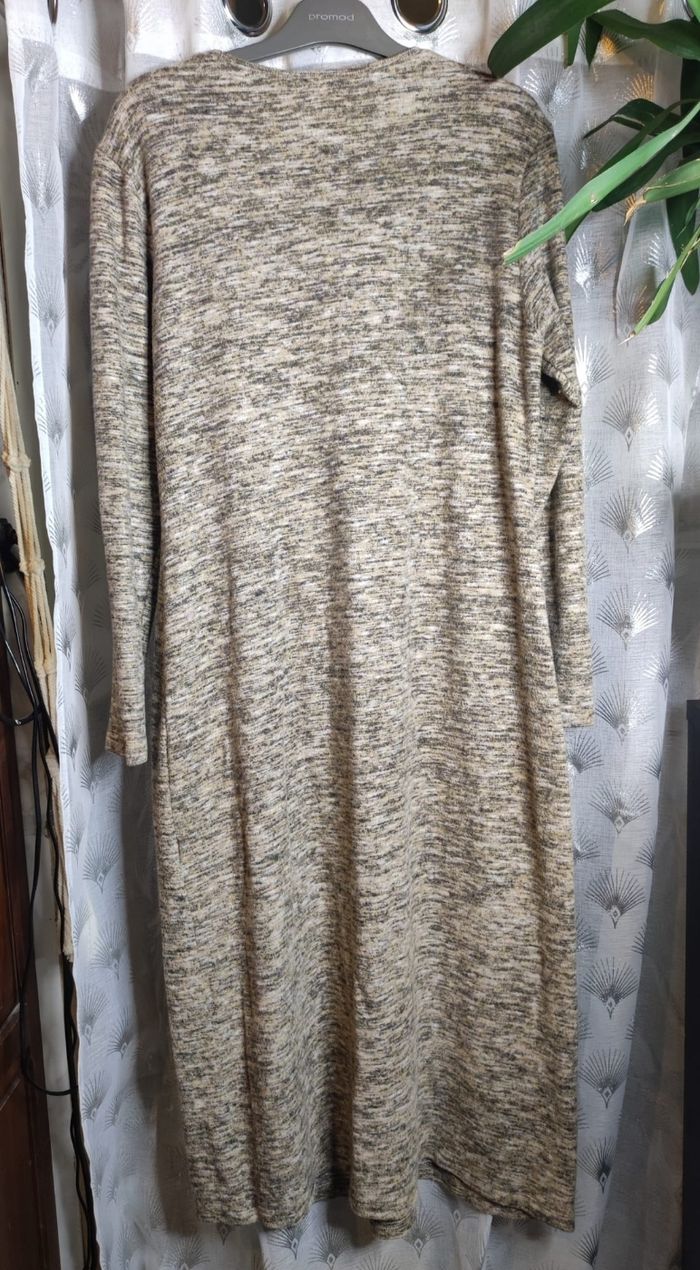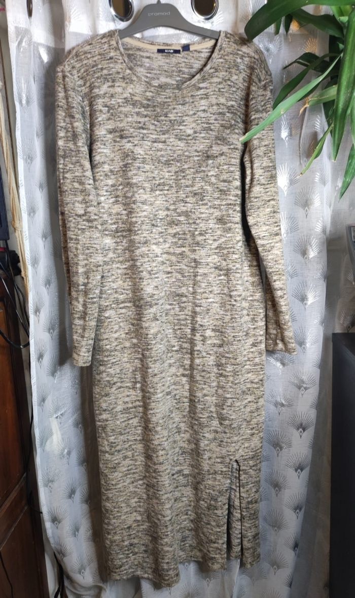 Robe longue de chez Kiabi affiche XL. Légèrement échancrée en bas, col rond et manches longues
