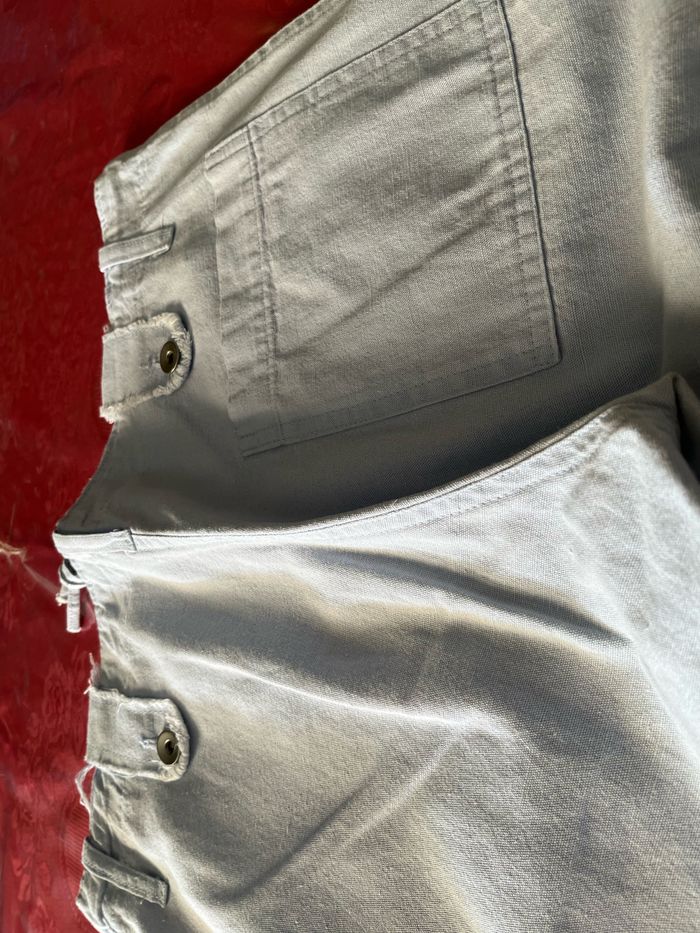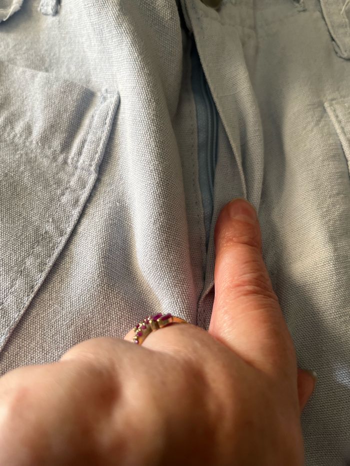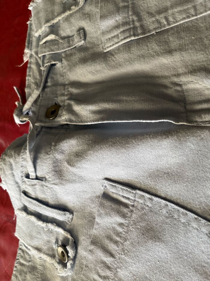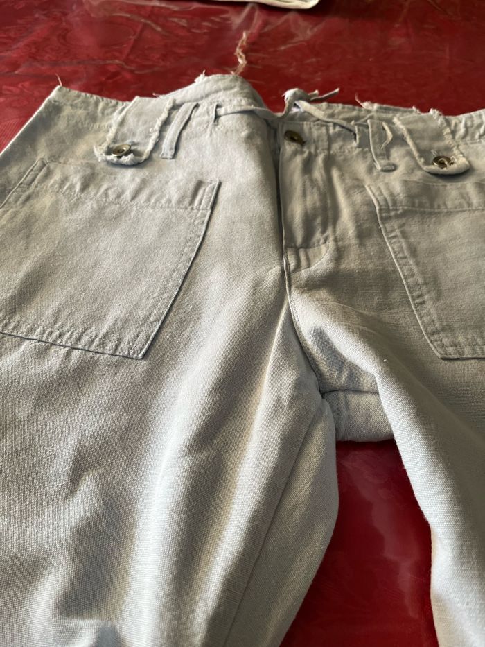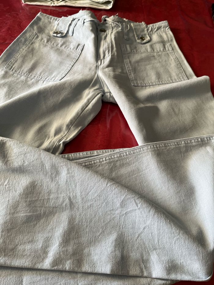 Pantalon femme taille 3 bleu ciel avec bouton et fermeture éclair et un cordon pour serrer la taille poches devant et derrière 60% coton 40% lin fabrication Française