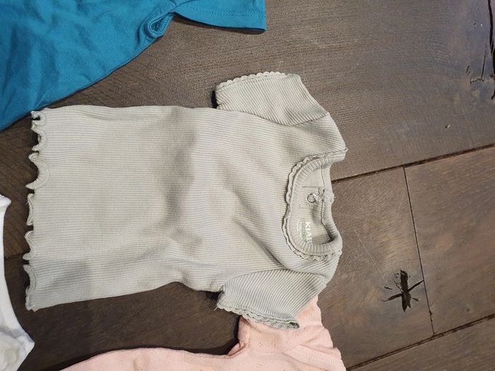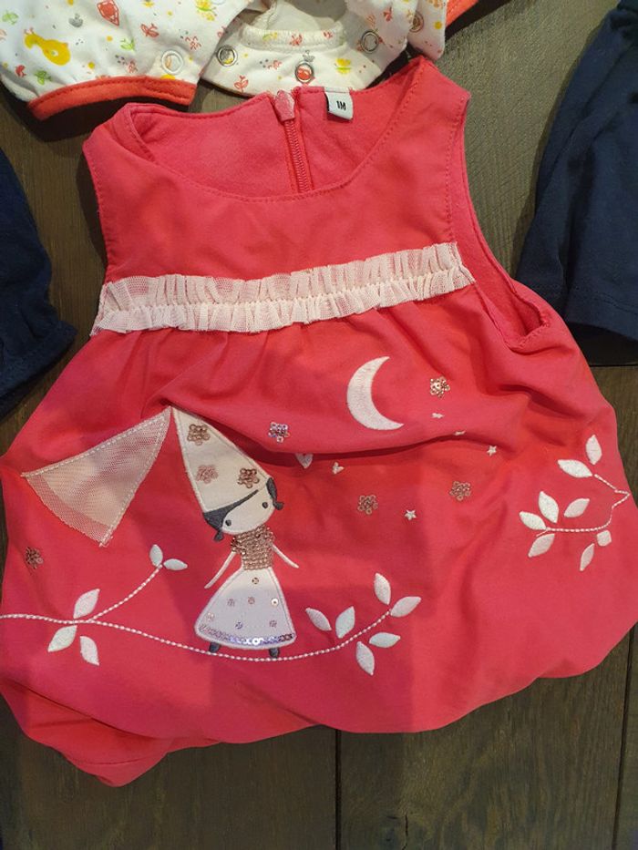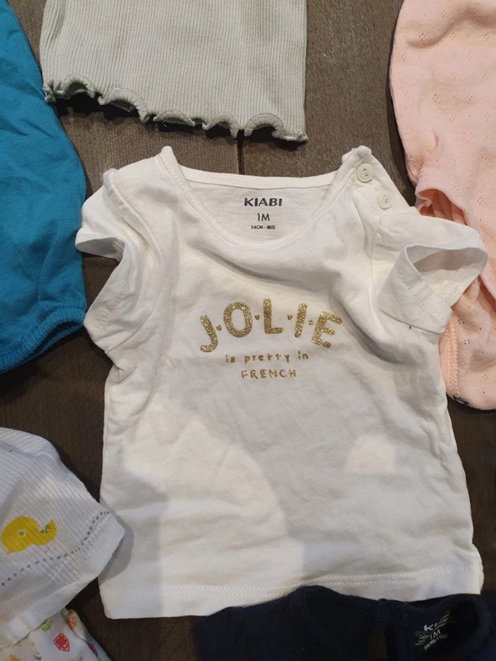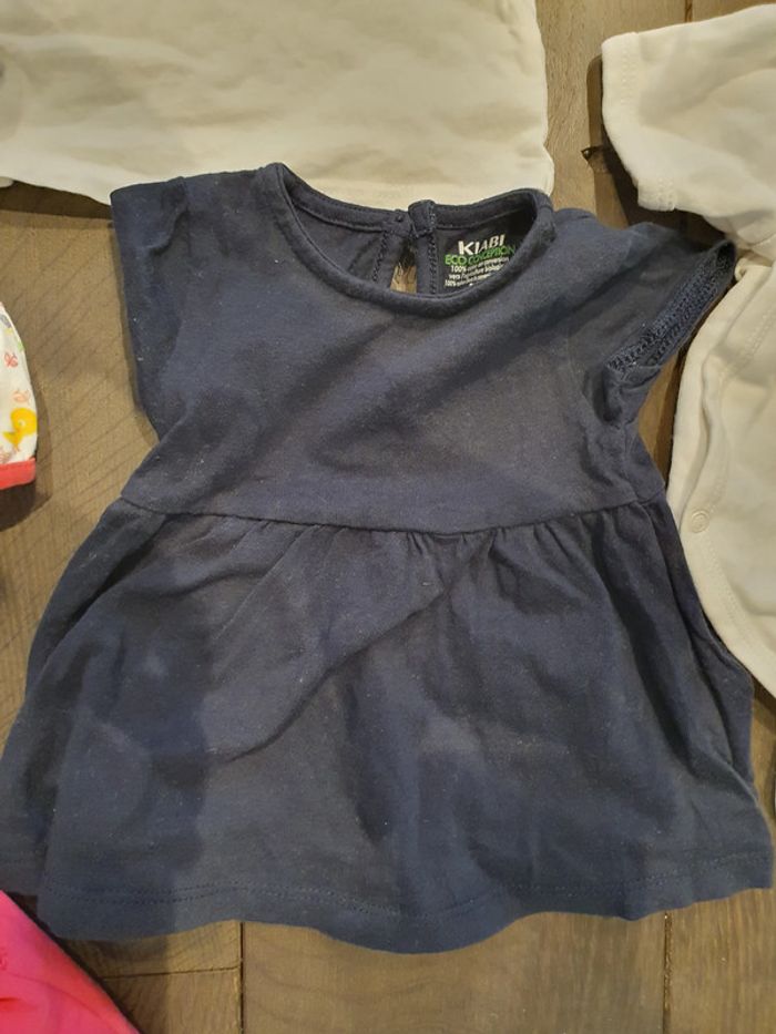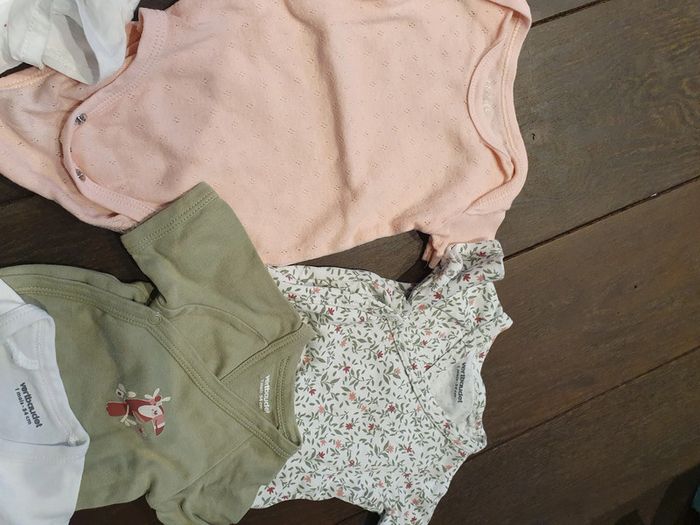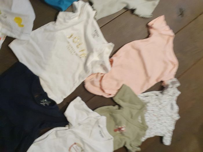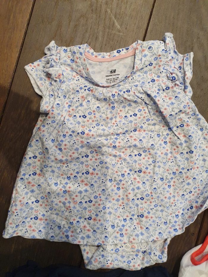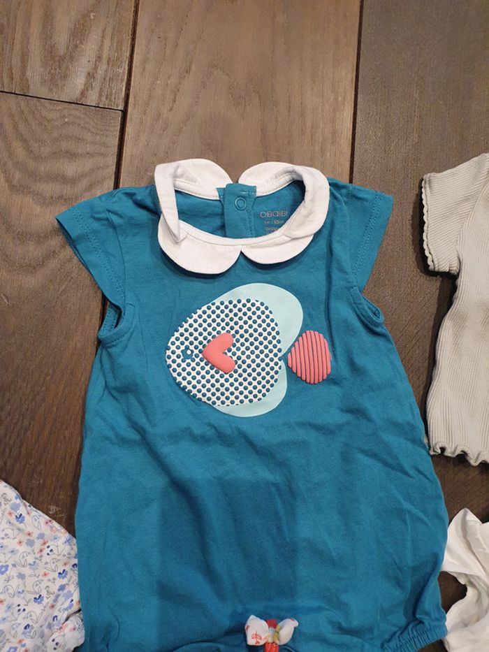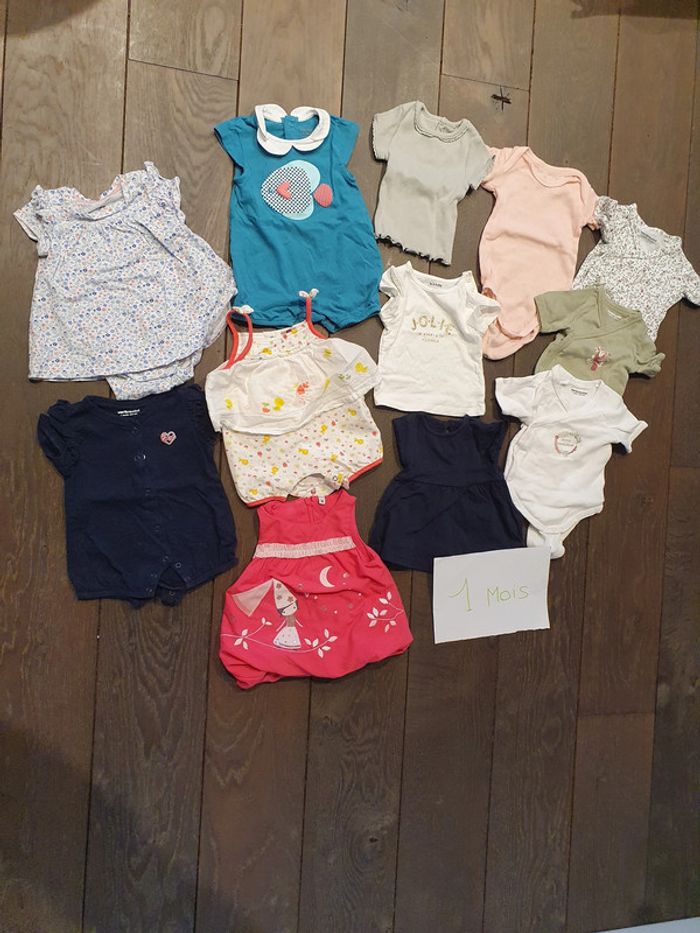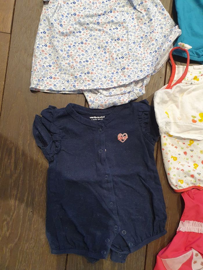 Le lot comprend : - 1 robe body à fleurs h&m 1-2 mois -1 barboteuse bleu foncee vertbaudet - 1 barboteuse turquoise obaibi - 1 robe rose - 1 barboteuse blanche à motif orchestra - 3 t shirt kiabi - 3 bodies vertbaudet - 1 body rose 50/56 cm La plupart des vêtements ont été achetés l année dernière. 12 pièces au total Possibilité de vente à l unité #Jujudemars020815fille1mois