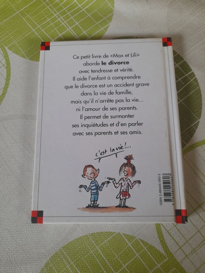 Livre en très bon état Max et Lili Tome 5 de la collection #Séparation #Divorce #Tristesse Dès 6 ans L’histoire : Lili console Zoé, qui est bouleversée car ses parents lui ont annoncé qu’ils allaient divorcer. Comment aider son amie à surmonter cette tristesse ? Le sujet : Ce livre de Max et Lili parle du divorce et de la séparation, de la souffrance de l’enfant et de son besoin d’aimer autant ses deux parents. La réflexion : Une histoire pour comprendre que le divorce est souvent vécu comme un drame, mais que la parole, la tendresse et la confiance permettent d’y faire face. Même si une séparation est une épreuve pour la famille, elle n’arrête pas la vie, ni l’amour des parents !