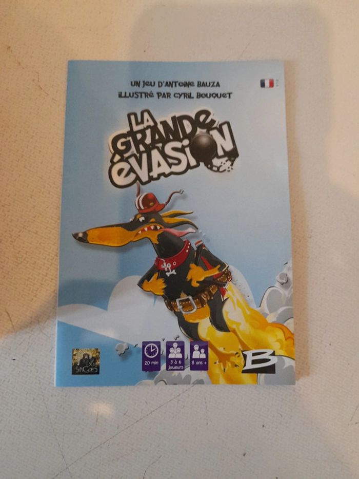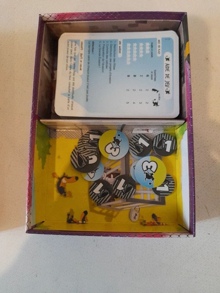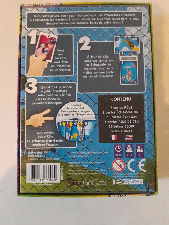 Jeu complet et en excellent état A partir de 8 ans De 3 à 6 joueurs Durée d'une partie 20 min Édition en français Vous seul savez si vous êtes prisonnier ou gardien, à tour de rôle jouez vos cartes sur les échappatoires possibles. Quand tout le monde A joué, choisissez votre position, vérifiez si les prisonniers peuvent s'échapper (la somme des cartes doit être supérieure ou égale à la valeur de l'échappatoire), puis révélez votre rôle. La présence d'un gardien empêche l'évasion