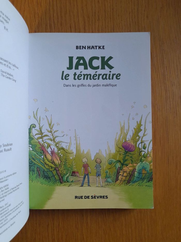 Jack le téméraire Dans les griffes du jardin maléfique Bande dessinée Tome 1 de la série Pour enfant de 8 à 12 ans Bon état car lu plusieurs fois Par l'auteur de zita la fille de l'espace - Ben Hatke Partagez l'immense courage de Jack, le nouveau héros de Ben Hatke, dans cette histoire contemporaine pleine de magie. L'été approche, ce qui est loin de ravir Jack qui, comme chaque année, va devoir s'occuper de sa jeune soeur Maddie, autiste et mutique, pendant que sa mère, célibataire, prend un deuxième boulot pour joindre les deux bouts. Mais les choses s'annoncent un peu différentes cet été : déjà, ils font connaissance avec leur nouvelle voisine, Lilly, bien délurée. Mais surtout, tout bascule lorsque Maddie se met à parler pour convaincre Jack d'acheter des graines à planter... qui vont s'avérer magiques, voire maléfiques ! Une étrange jungle pousse alors dans leur jardin, où ils feront d'étranges rencontres, seront l'objet d'attaques multiples, jusqu'à l'enlèvement de Maddie. Jack et Lilly vont devoir grandir bien vite pour tenter de contrôler la situation...