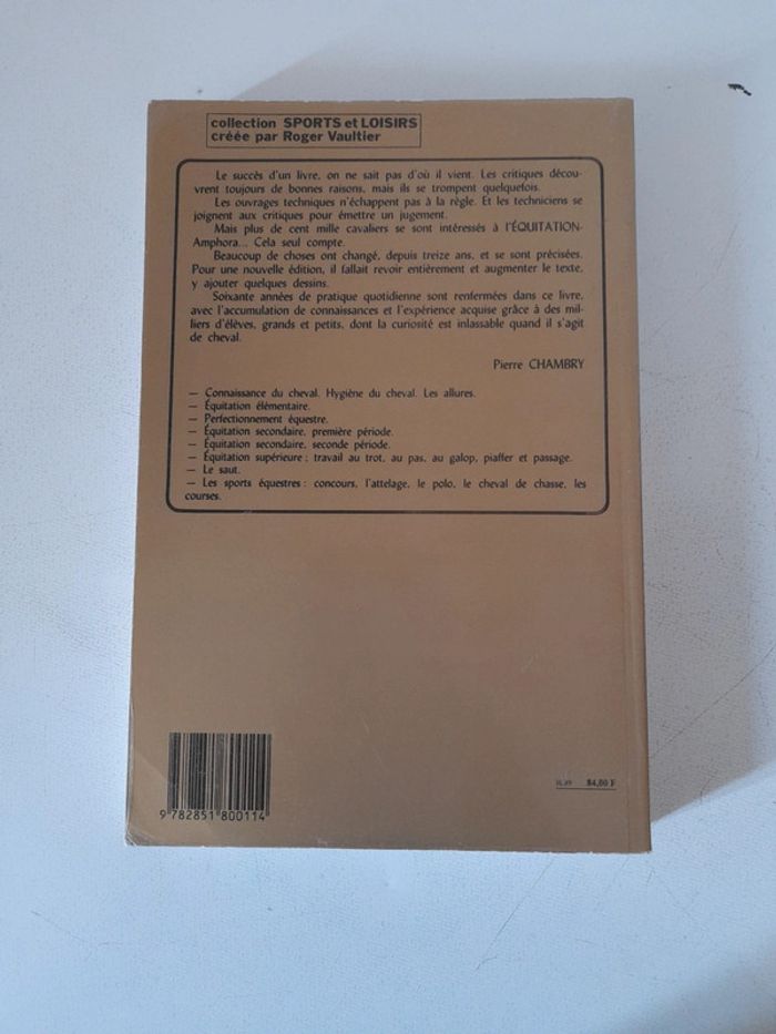 Livre en tres bon état pour son âge Édition Amphora de 1989 Technique, dressage et perfectionnement Plus de cent mille cavaliers se sont intéressés à l'équitation cela seul compte. Beaucoup de choses ont changé, depuis 13 ans, et se sont précisées. Pour une nouvelle édition, il fallait revoir entièrement et augmenter le texte, y ajouter quelques dessins. 60 années de pratiques quotidiennes sont renfermées dans ce livre, avec l'accumulation de connaissances et l'expérience acquise grâce à des milliers d'élèves, grands et petits, dont la curiosité est un lasable quand il s'agit de cheval.