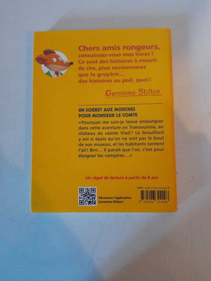 Geronimo stilton Un sorbet aux mouches pour monsieur le comte Tome 3 de la série de base Albin michel jeunesse Pourquoi me suis-je laissé embarquer dans cette aventure en Transourisia, au château du comte Vlad ? Le brouillard y est si épais qu'on ne voit pas le bout de son museau, et les habitants sentent l'ail ! Brrr... Il paraît que l'ail, c'est pour éloigner les vampires... À partir de 8 ans