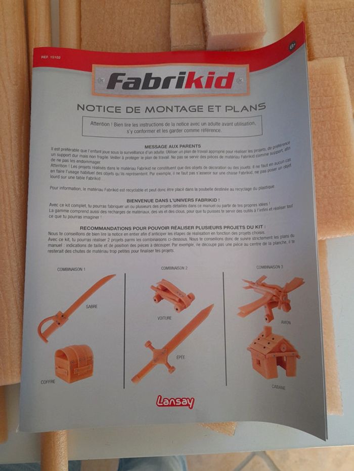 Kit de Fabrication pour construire 3 projets parmi 6 : une cabane, une voiture de course, un coffre-fort, deux épées et un petit avion