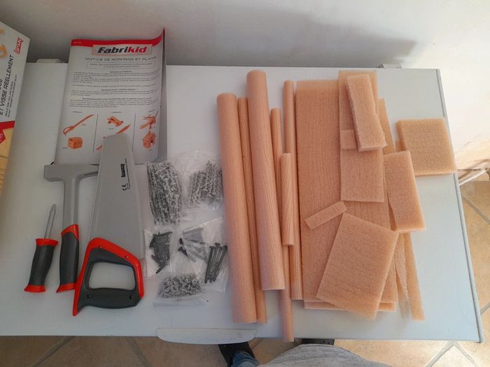 Contient : des planches et rondins, 1 marteau, 1 grande scie, 1 tournevis, des vis, des clous et 1 livret de constructions